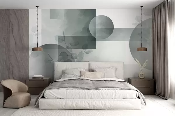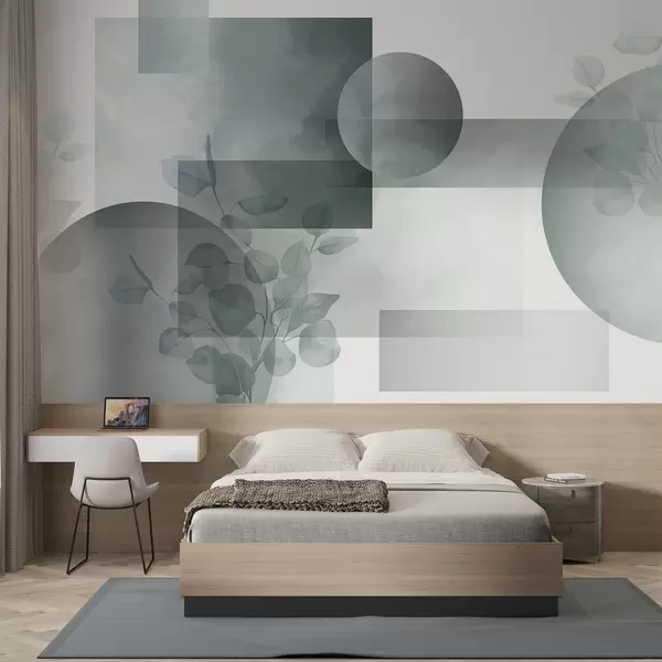 Murais de parede Desenho geométrico minimalista moderno abstrato com círculos e retângulos, folhas de eucalipto, efeito de aquarela Nr. w09110