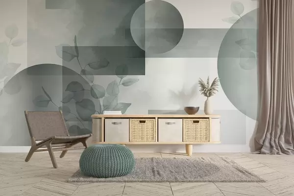 Murais de parede Desenho geométrico minimalista moderno abstrato com círculos e retângulos, folhas de eucalipto, efeito de aquarela Nr. w09110