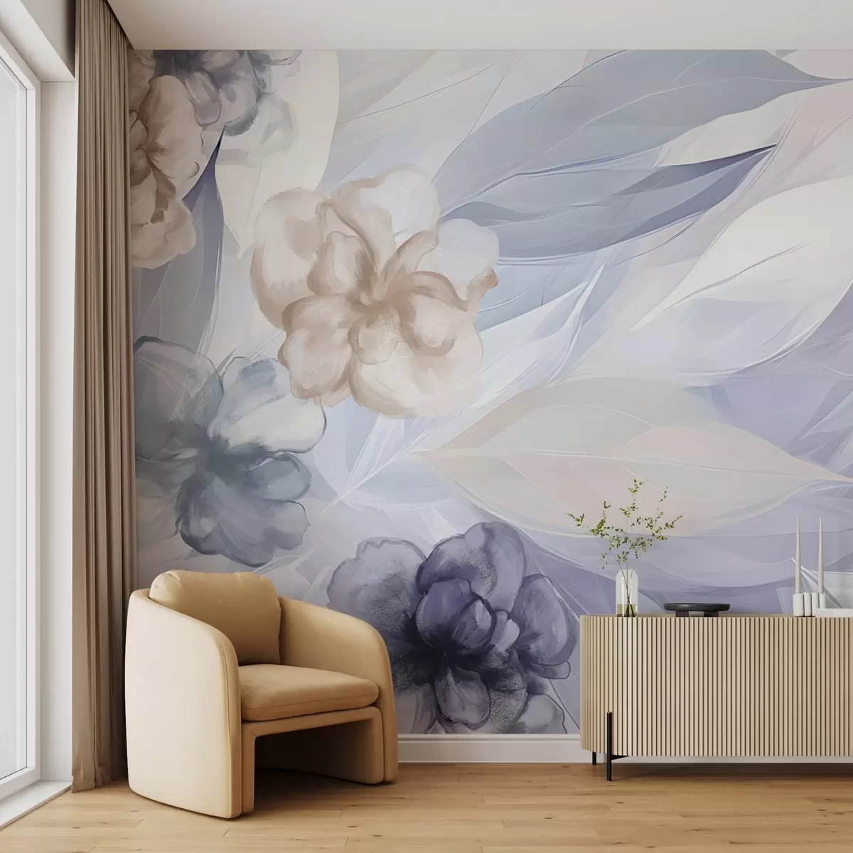 Murais de parede Flores e folhas delicadas em tons de branco, azul, roxo e bege, fundo floral, cores suaves, pétalas delicadas Nr. w09111