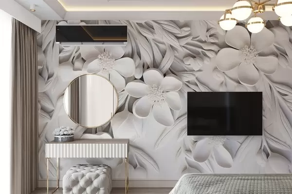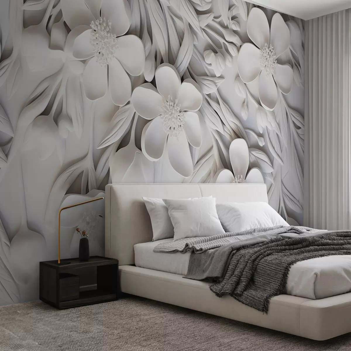 Murais de parede Flores brancas e folhas em um fundo branco, floral elegante, design decorativo, detalhes intrincados Nr. w09113
