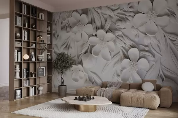 Murais de parede Flores brancas e folhas em um fundo branco, floral elegante, design decorativo, detalhes intrincados Nr. w09113