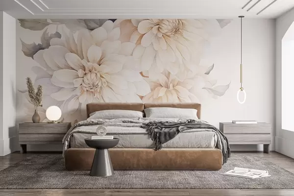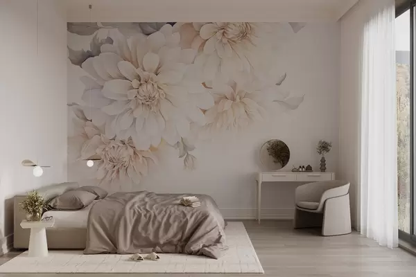 Murais de parede Dálias em tons pastéis com pétalas suaves e delicadas de pêssego e luz branca em estilo aquarela, fundo suave Nr. w09115