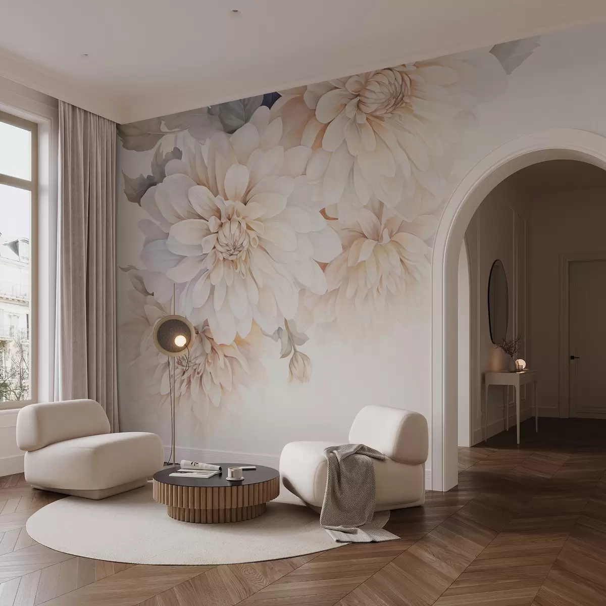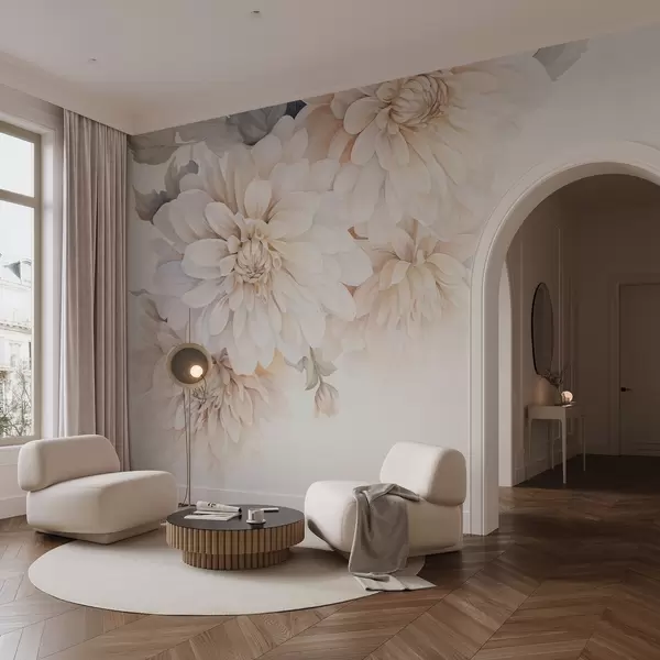 murais de parede Dálias em tons pastéis com pétalas suaves e delicadas de pêssego e luz branca em estilo aquarela, fundo suave w09115