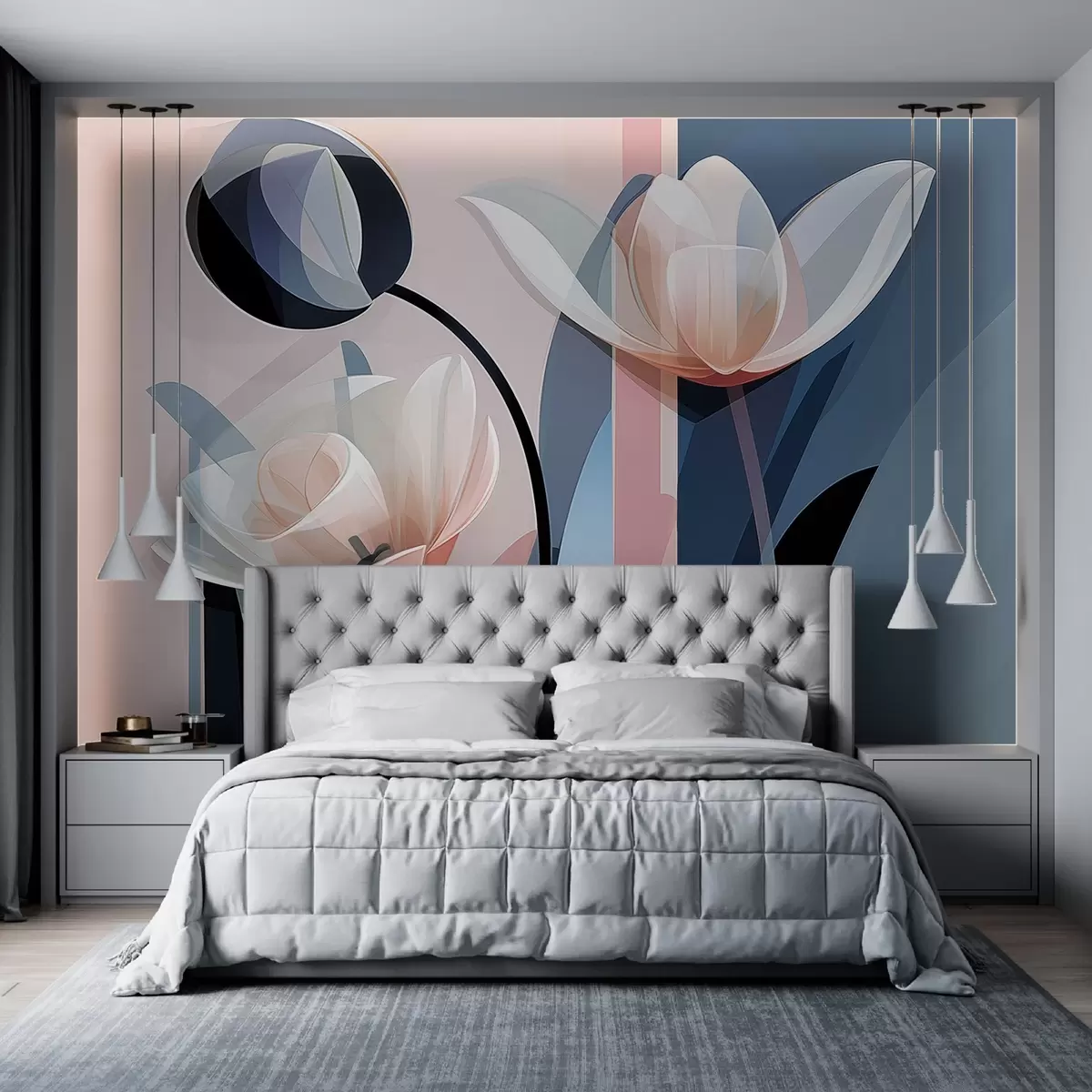 Murais de parede Design moderno abstrato com tulipas com pétalas transparentes em tons pastéis de rosa, branco e azul escuro Nr. w09116