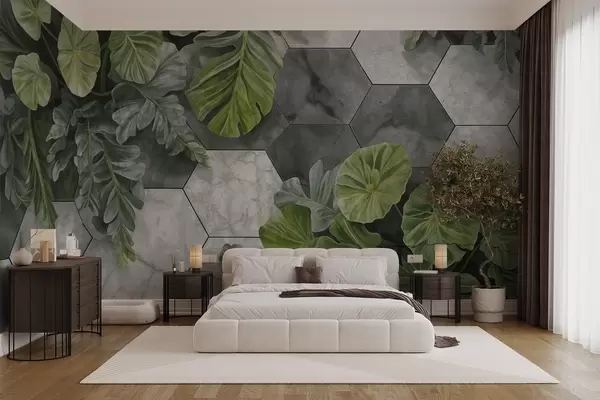 Murais de parede Folhas e plantas tropicais verdes em um fundo de azulejos texturizados cinza e branco, design moderno de folhagem exuberante Nr. w09117