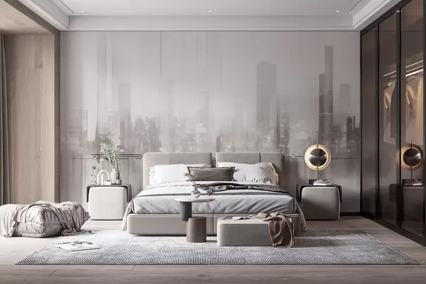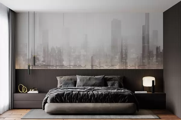 Murais de parede Paisagem urbana abstrata texturizada com edifícios altos e faixas, em tons de cinza e branco, criando um efeito nebuloso Nr. w09119