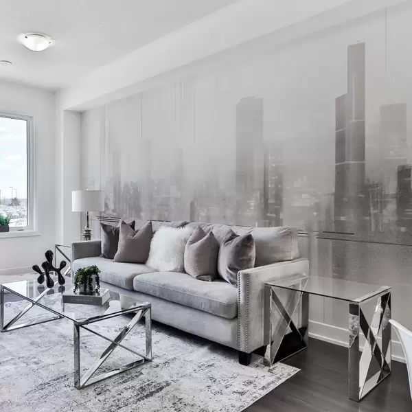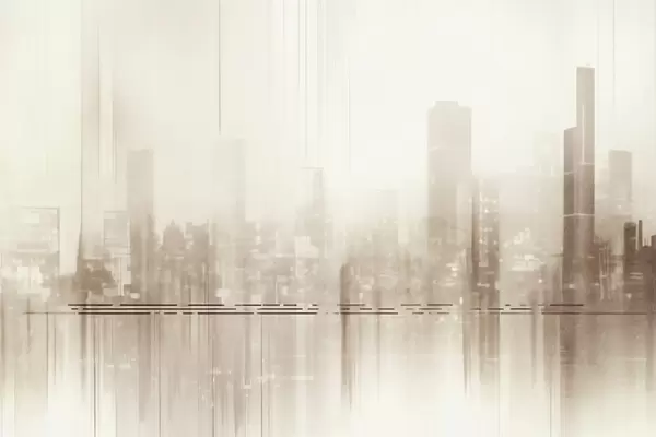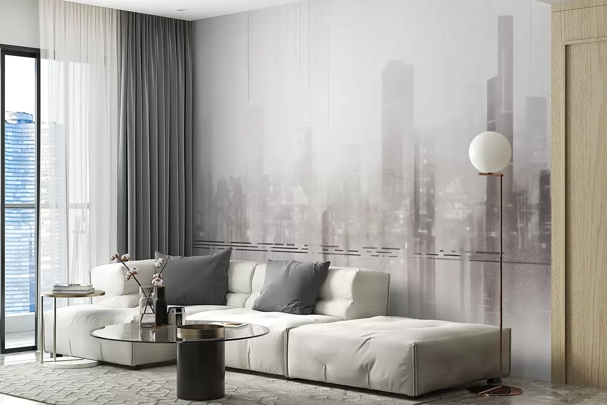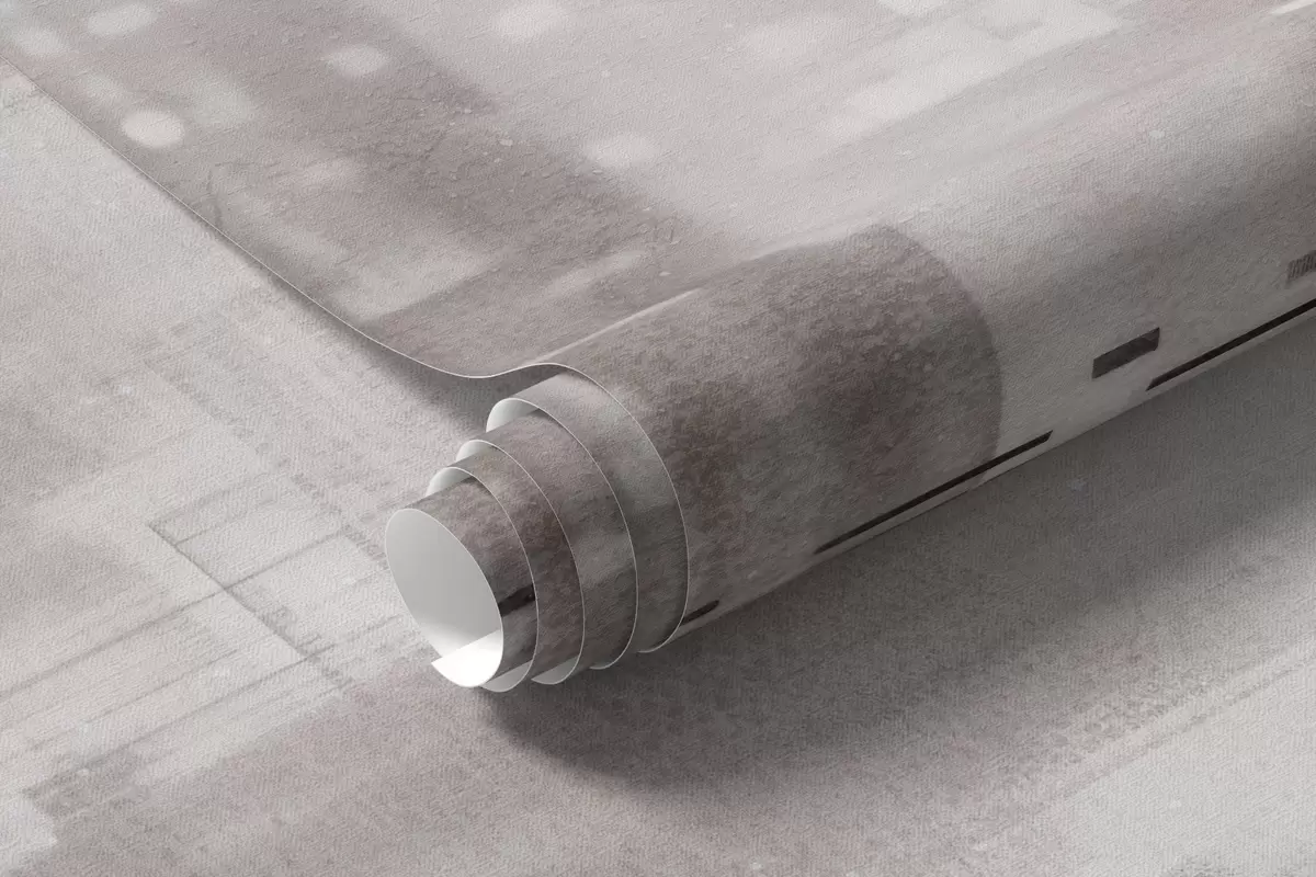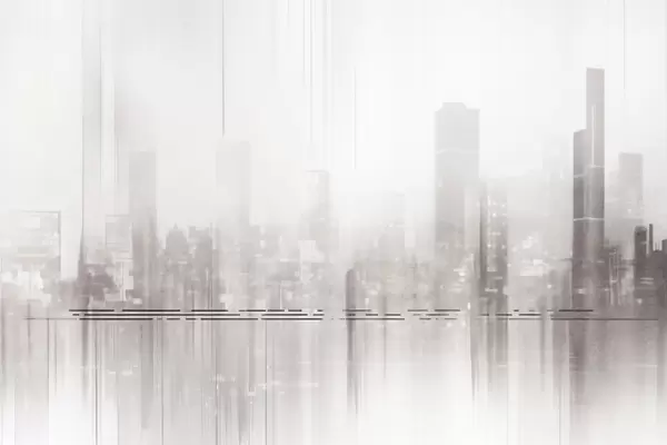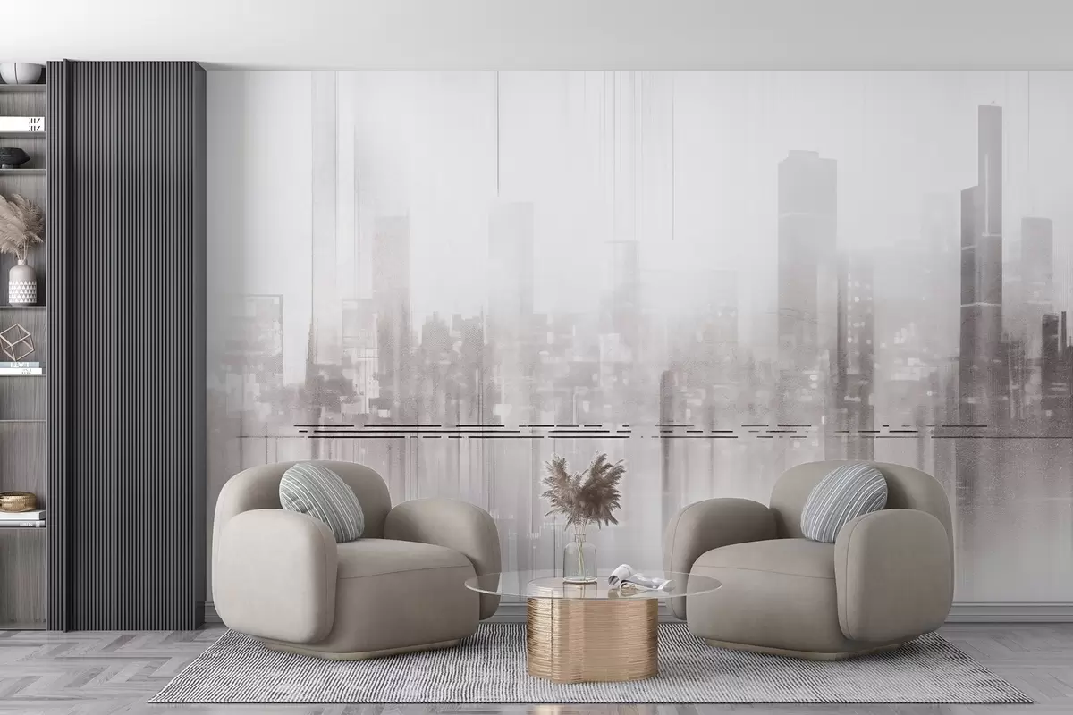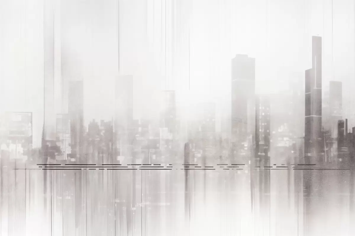 Murais de parede Paisagem urbana abstrata texturizada com edifícios altos e faixas, em tons de cinza e branco, criando um efeito nebuloso Nr. w09119