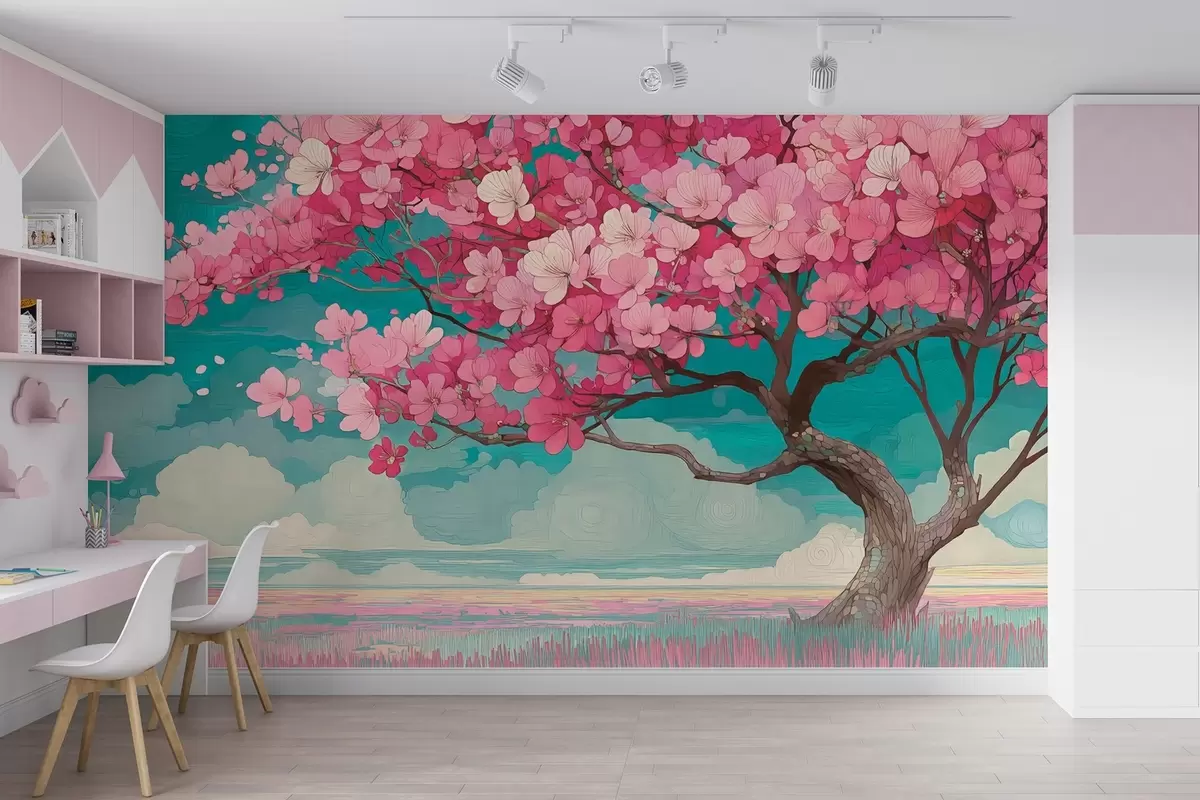 Murais de parede Uma cerejeira em flor rosa com pétalas caindo e um céu azul em um estilo romântico Nr. w09120