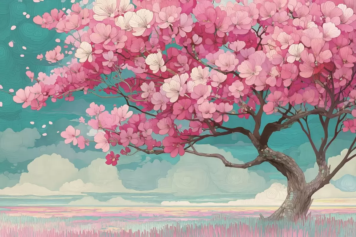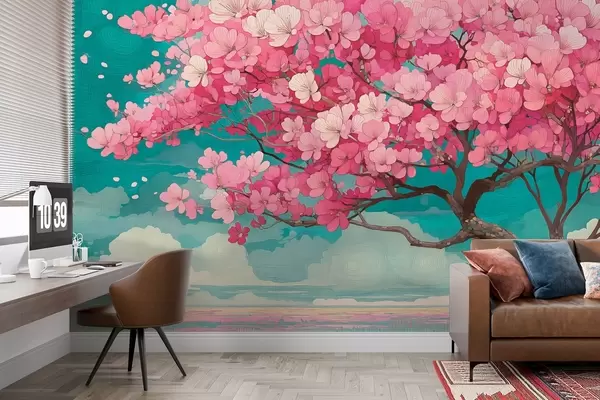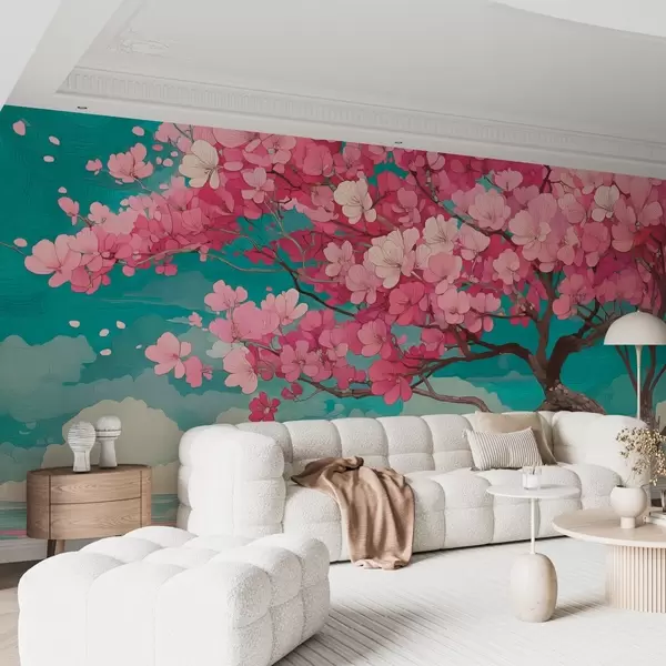 Murais de parede Uma cerejeira em flor rosa com pétalas caindo e um céu azul em um estilo romântico Nr. w09120