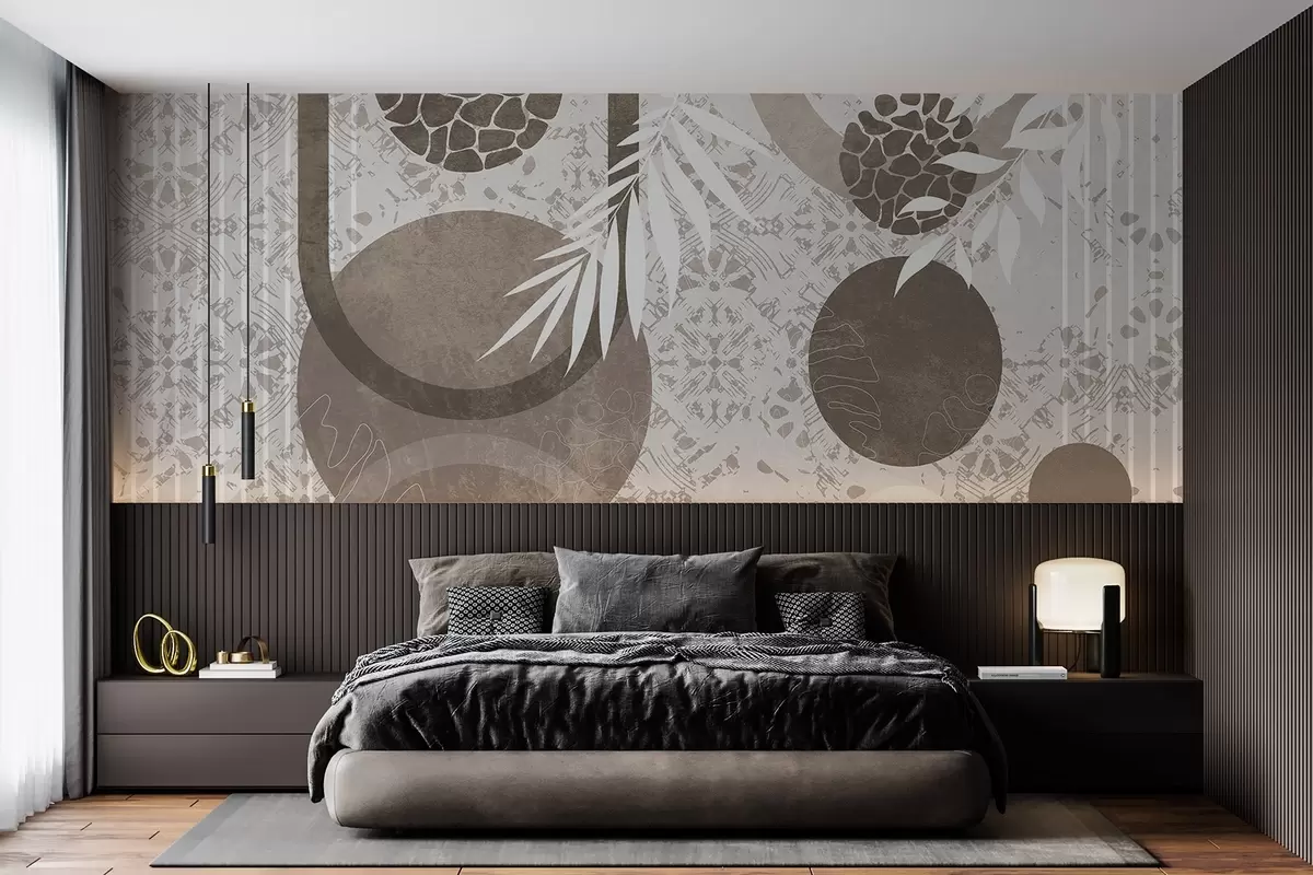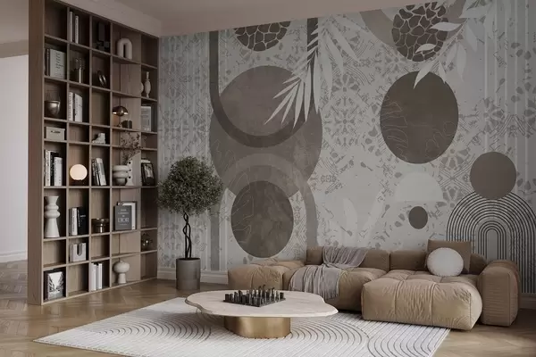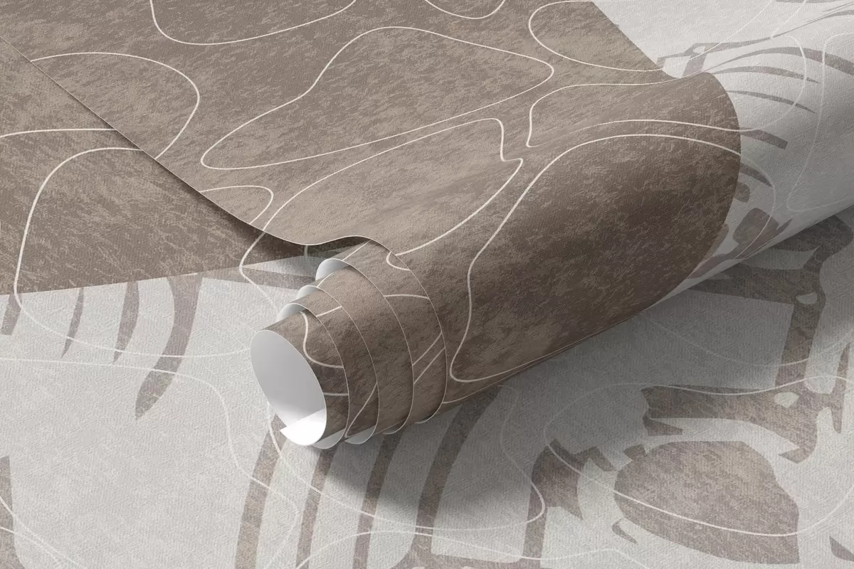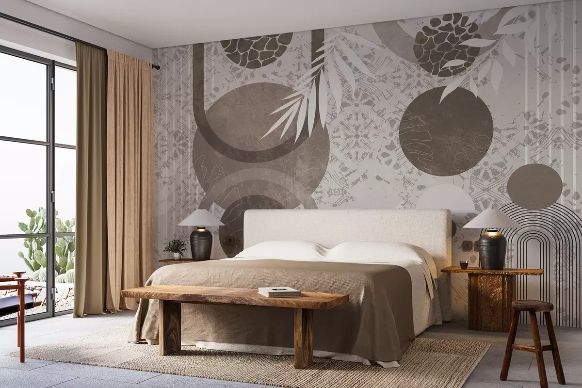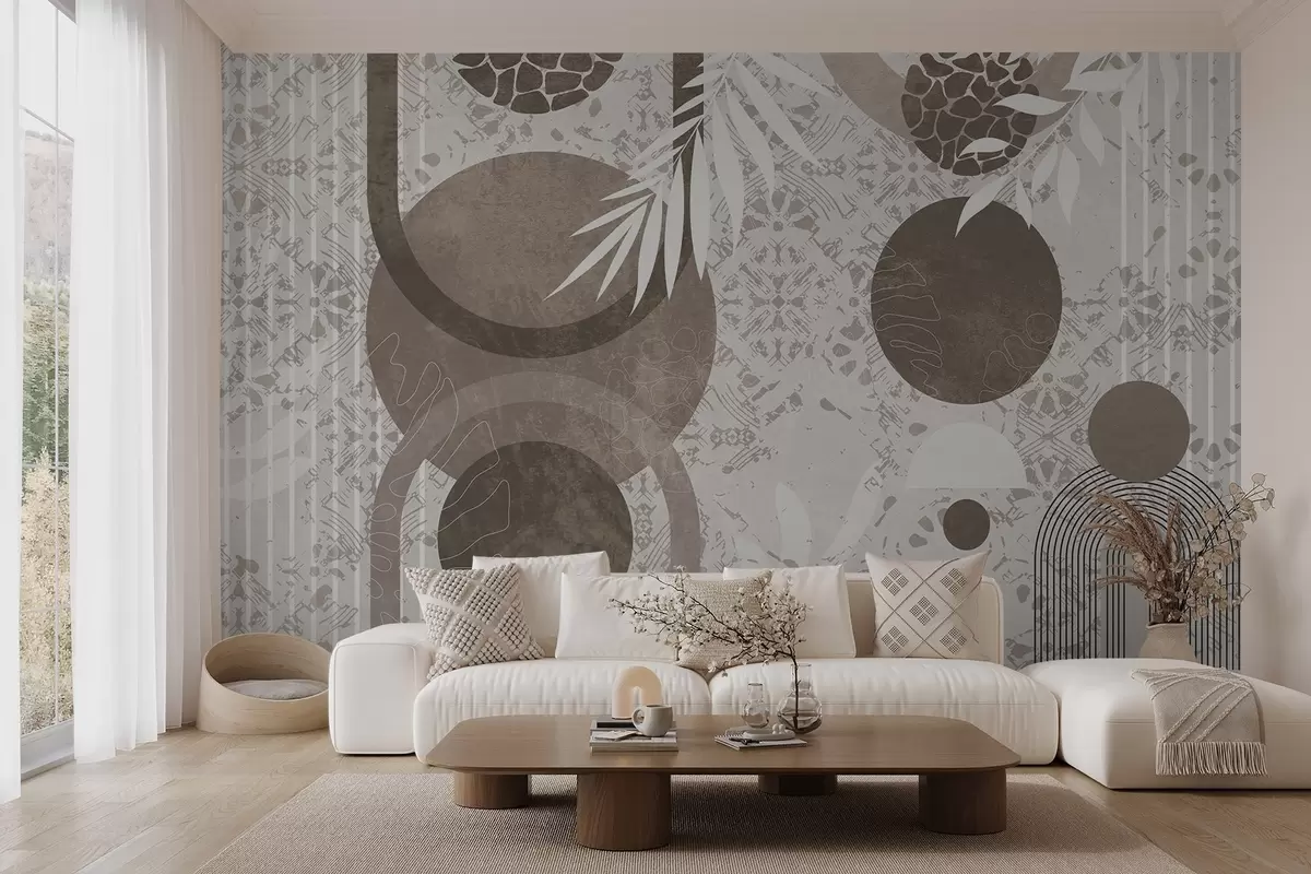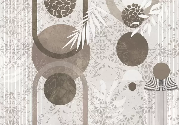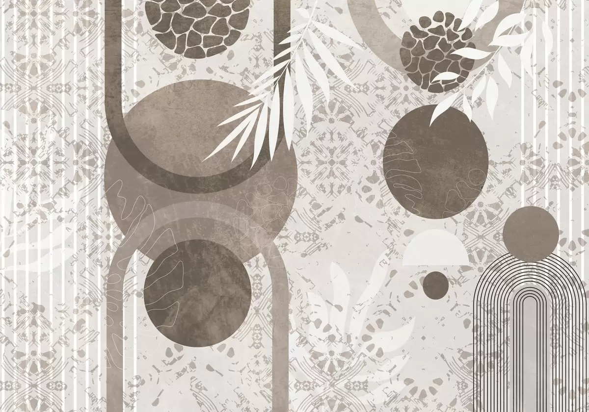 Murais de parede Formas geométricas abstratas texturizadas em marrom e branco, círculos, arcos e elementos botânicos, design moderno e minimalista Nr. w09130