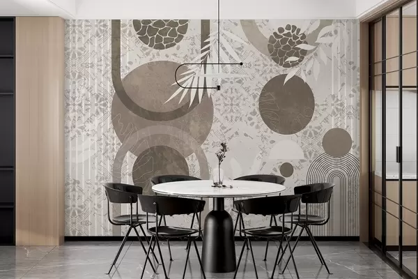 Murais de parede Formas geométricas abstratas texturizadas em marrom e branco, círculos, arcos e elementos botânicos, design moderno e minimalista Nr. w09130