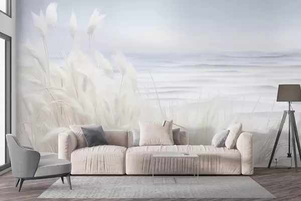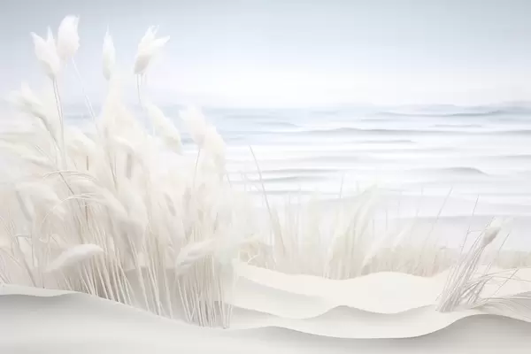 Murais de parede Paisagem com grama branca dos pampas em uma duna de areia, com um oceano azul claro ao fundo, estilo suave e minimalista Nr. w09132