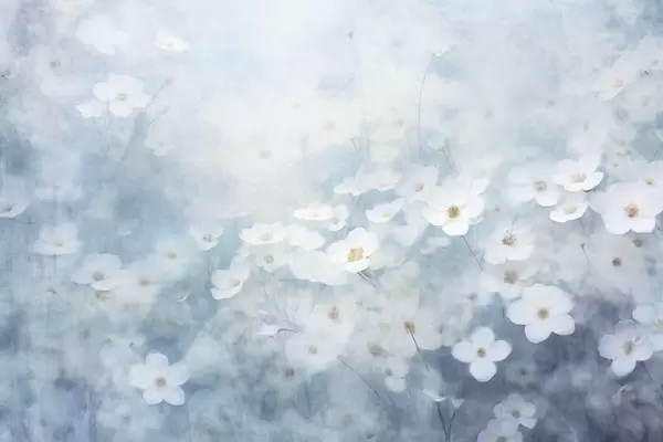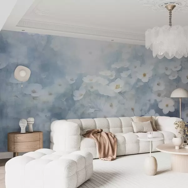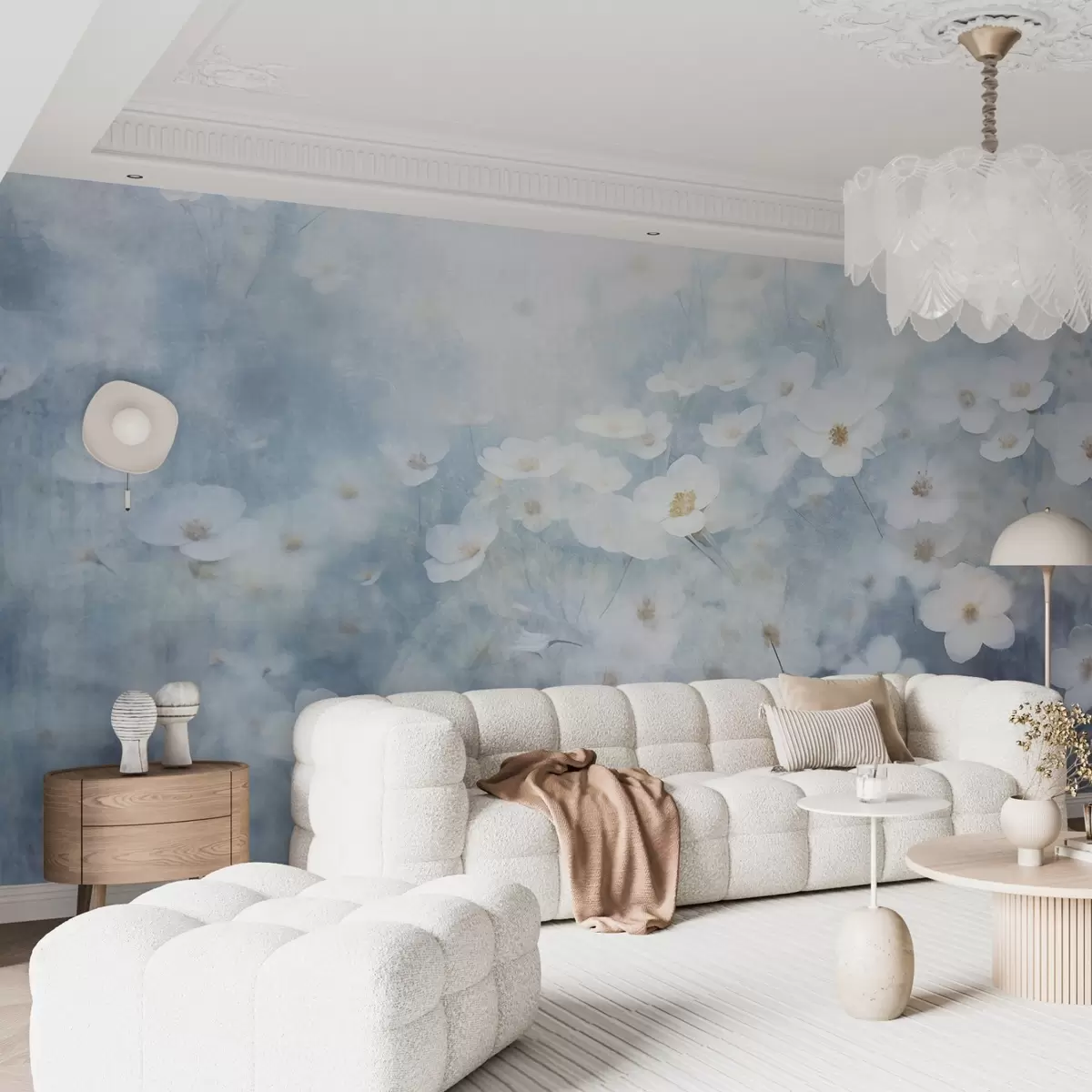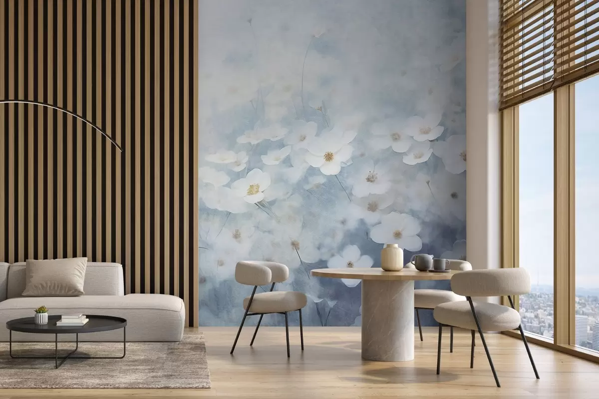murais de parede Campo textural de flores de anêmona branca, foco suave, atmosfera sonhadora, paleta de cores azul-claro e branco, prado de primavera w09134