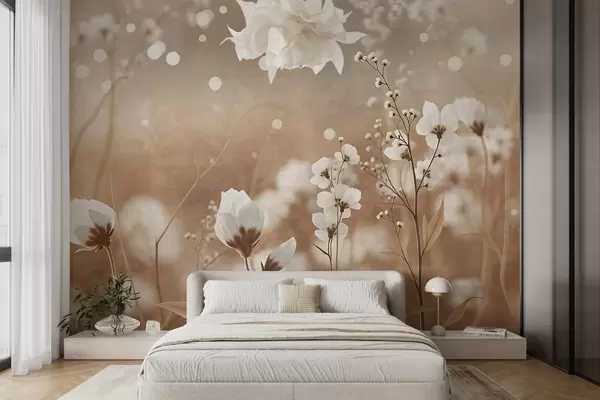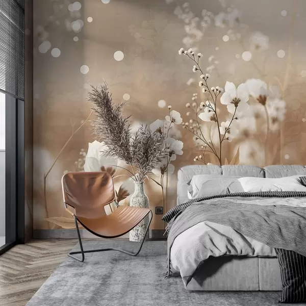 Murais de parede Flores brancas com caules e folhas marrons em um campo, efeito bokeh, paleta de cores quentes, obra de arte elegante inspirada na natureza Nr. w09135