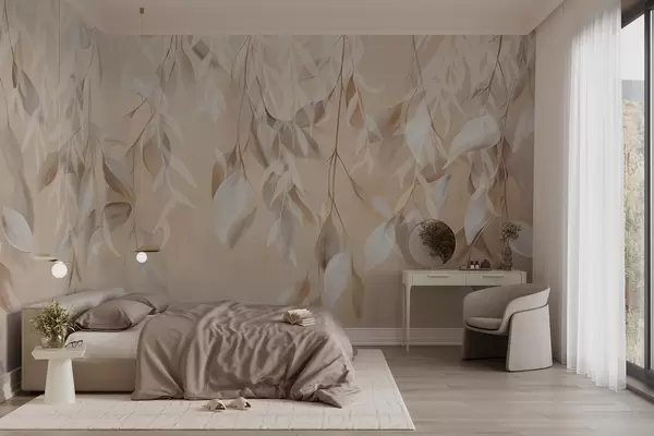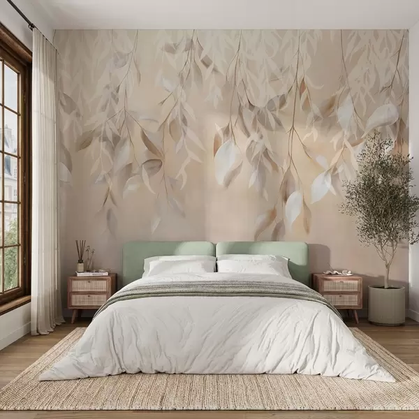 Murais de parede Folhas brancas e bege texturizadas penduradas com uma paleta de cores suaves, pêssego, cinza e fundo branco delicado Nr. w09136