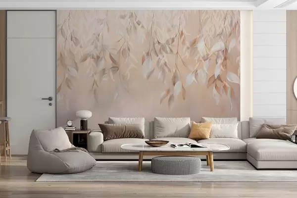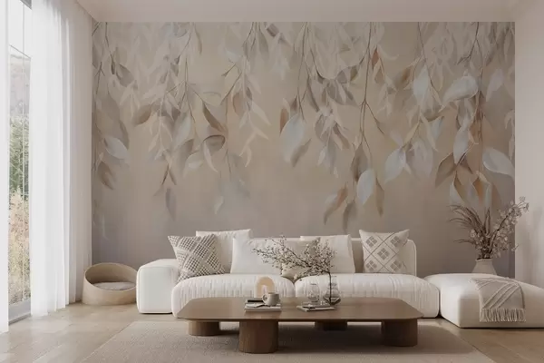 Murais de parede Folhas brancas e bege texturizadas penduradas com uma paleta de cores suaves, pêssego, cinza e fundo branco delicado Nr. w09136