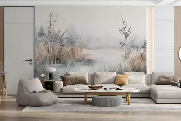 Murais de parede Paisagem texturizada de um lago com grama alta em primeiro plano, azul e marrom suaves, água calma, árvores à distância Nr. w09137