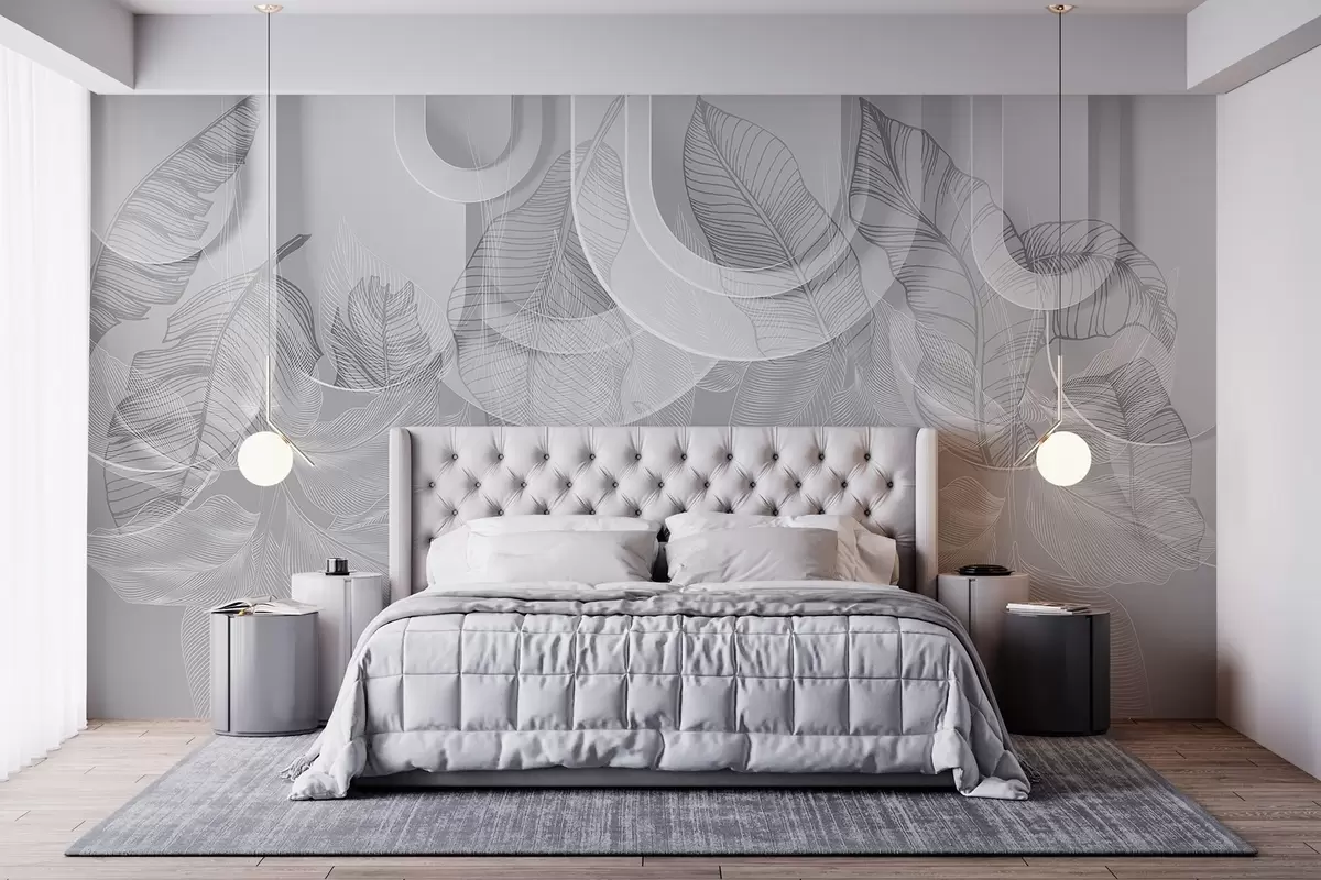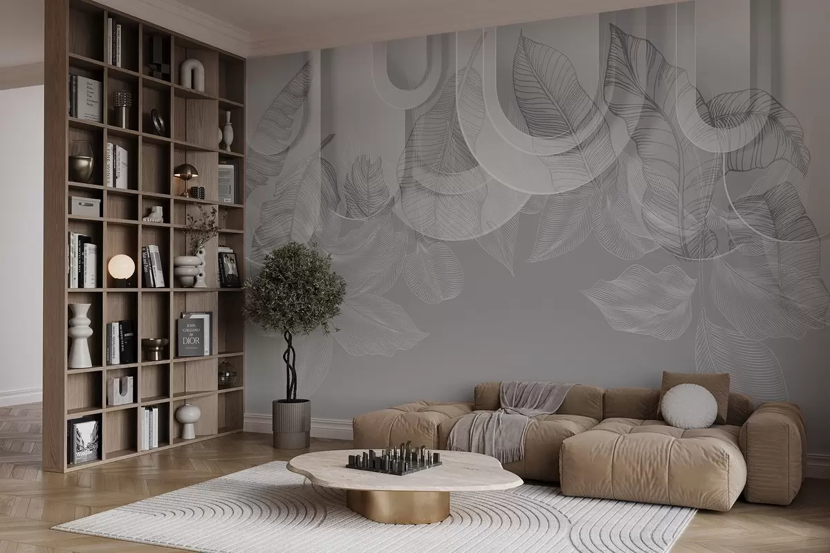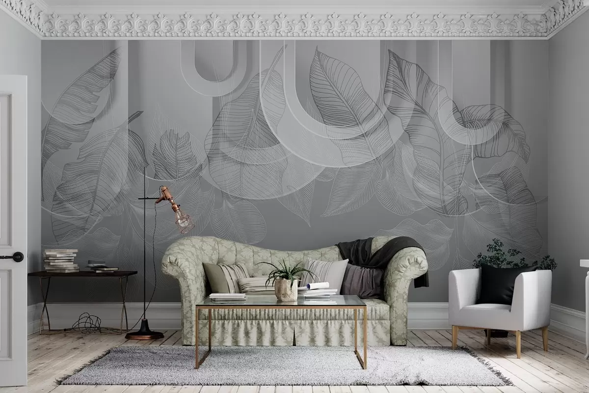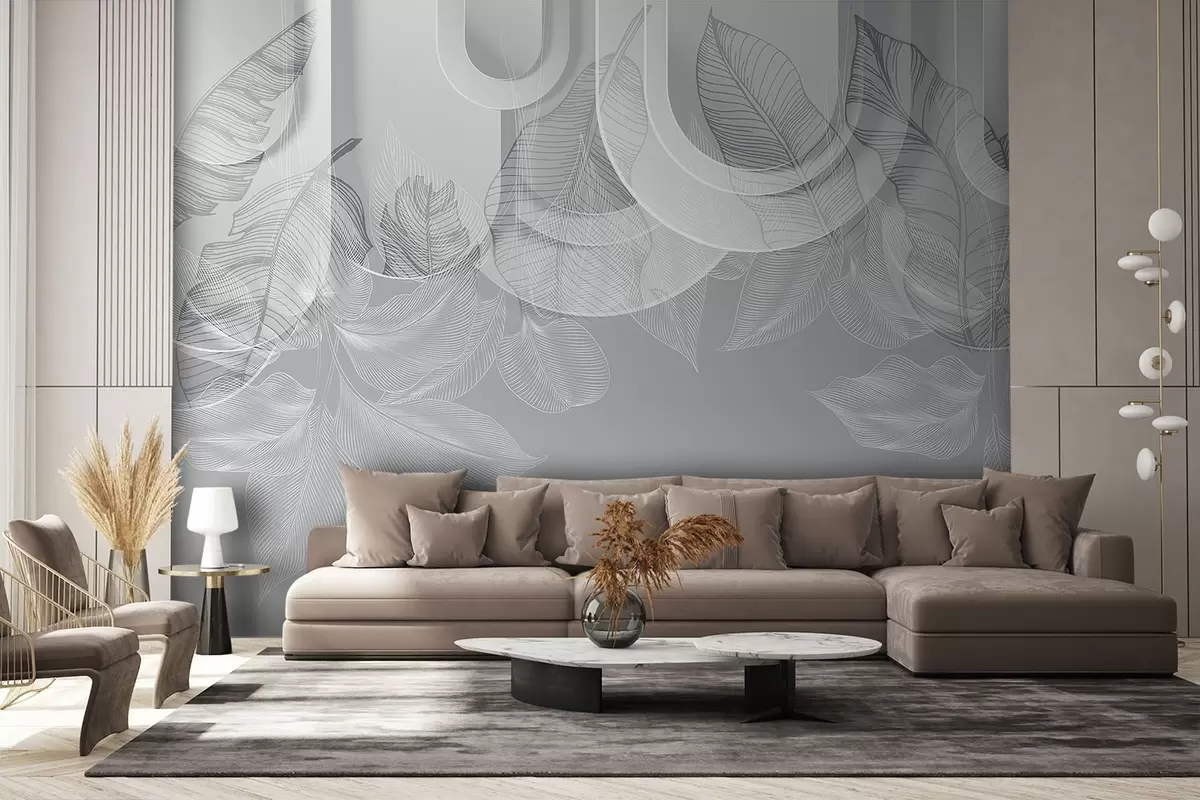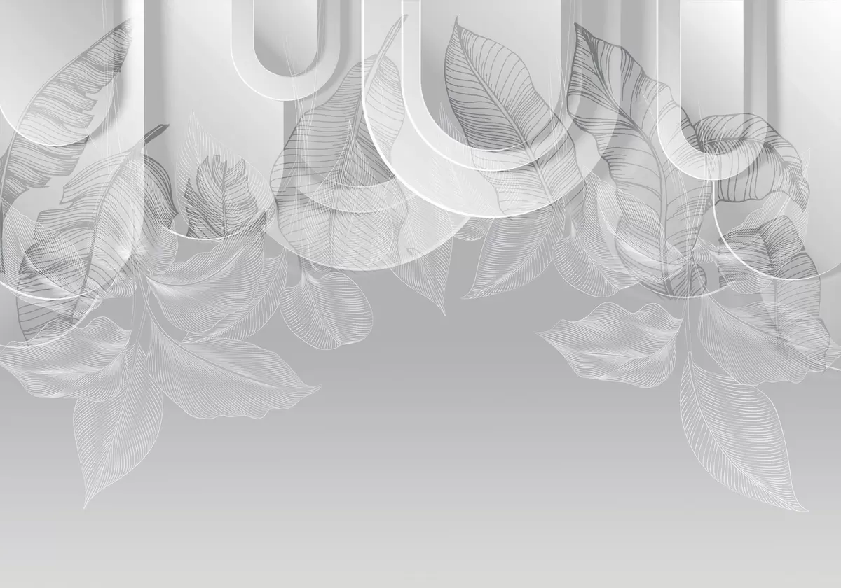 Murais de parede Fundo abstrato com arcos cinza e folhas tropicais brancas, design minimalista, elegante e moderno, paleta de cores neutras Nr. w09138