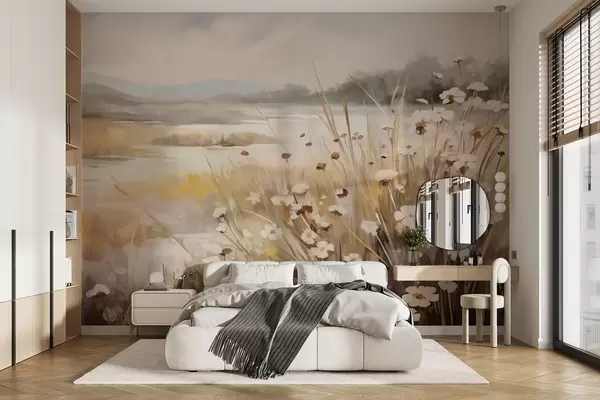 Murais de parede Campo de grama alta e margaridas brancas, árvores ao fundo, sob um céu nublado, paisagem texturizada, pinceladas suaves Nr. w09139