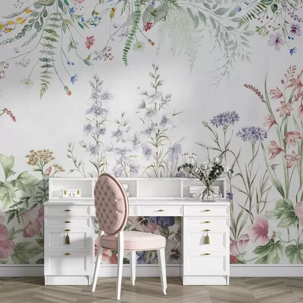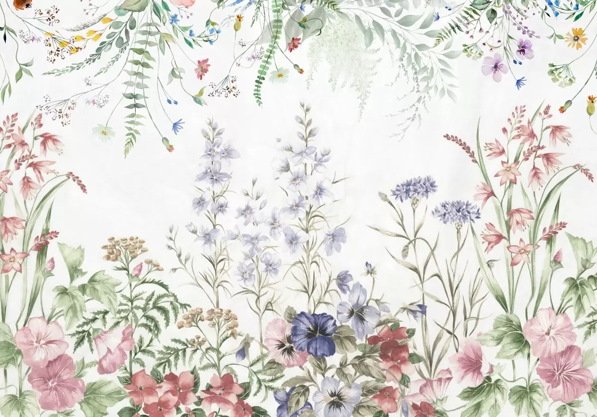 Murais de parede Arranjo floral textural com flores coloridas e folhas verdes, ilustração botânica, cores pastéis suaves, estilo vintage Nr. w09143