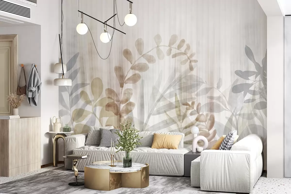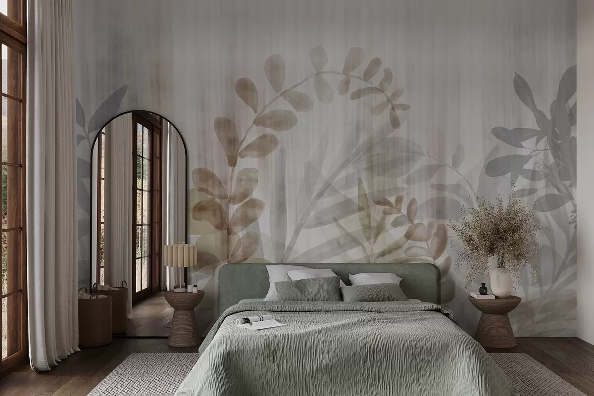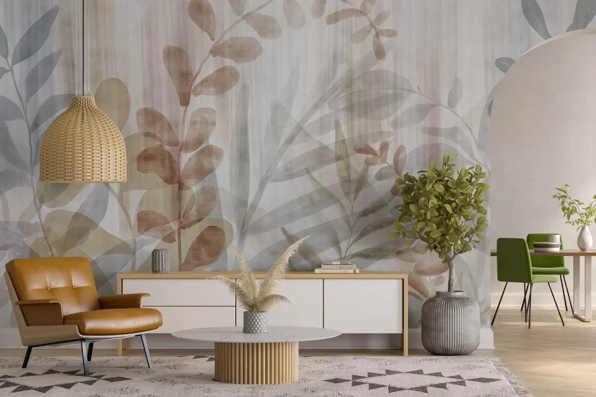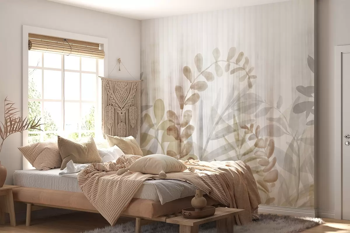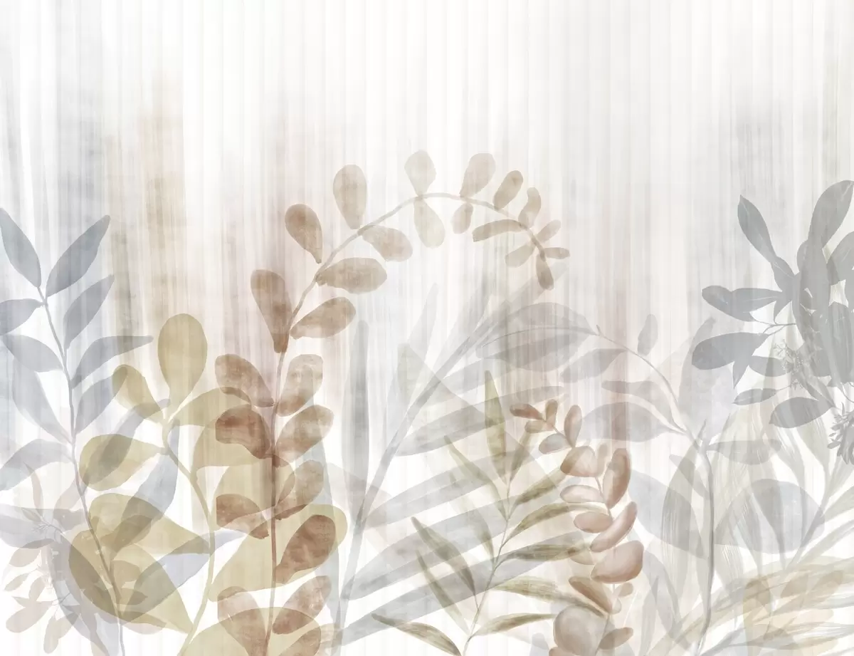 Murais de parede Pintura em aquarela imitando plantas com folhas multicoloridas e suaves, fundo claro com linhas verticais, ilustração botânica Nr. w09146