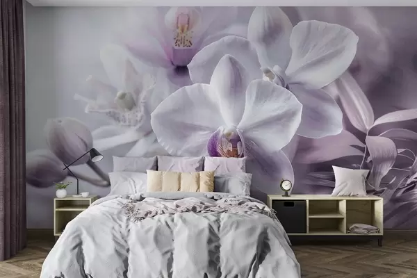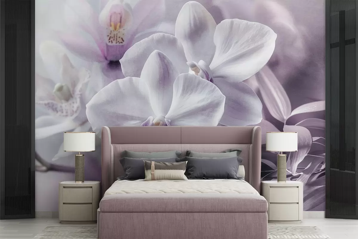 Murais de parede Flores de orquídeas delicadas brancas e lilás, iluminação suave e um fundo texturizado desfocado Nr. w09155