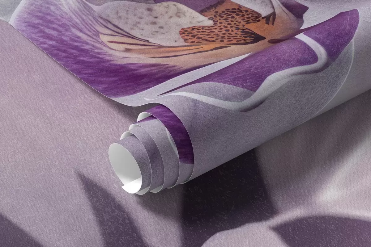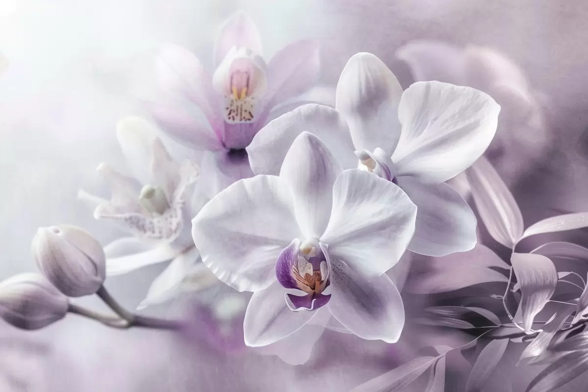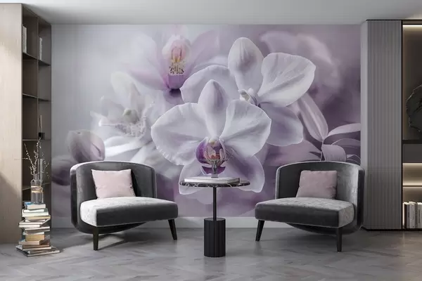 Murais de parede Flores de orquídeas delicadas brancas e lilás, iluminação suave e um fundo texturizado desfocado Nr. w09155