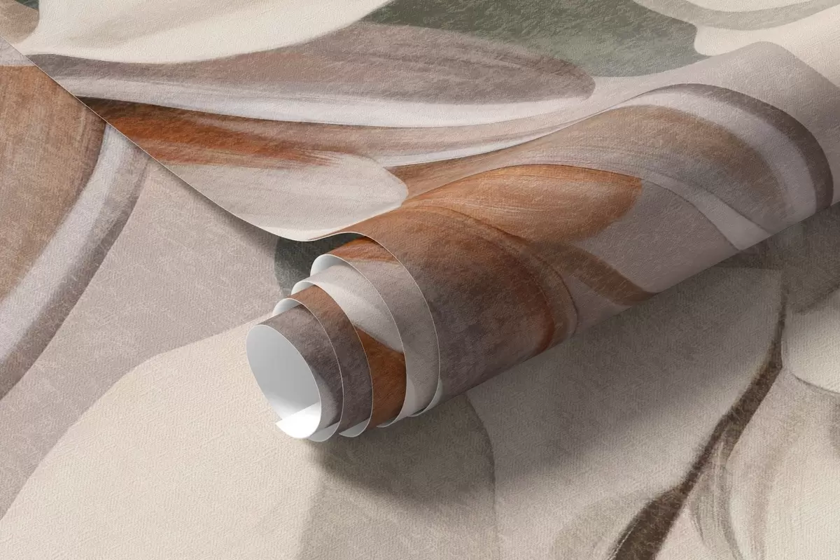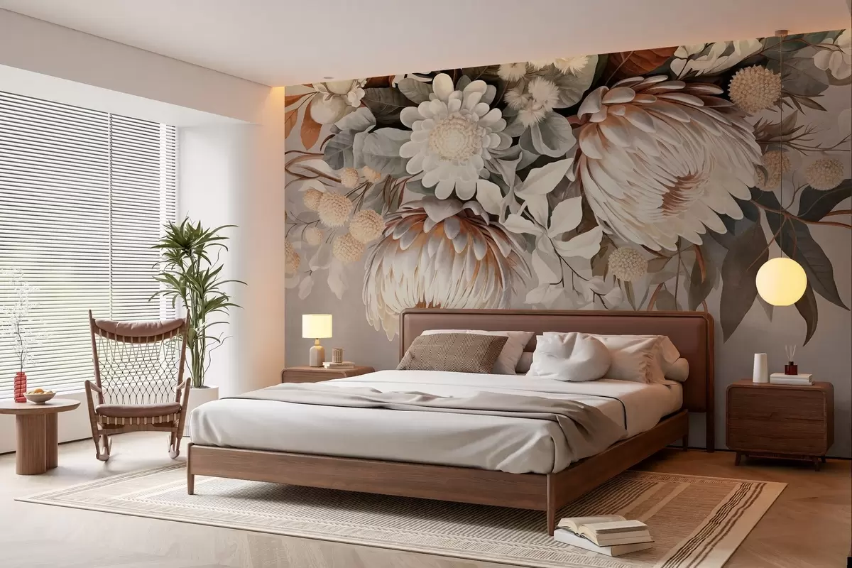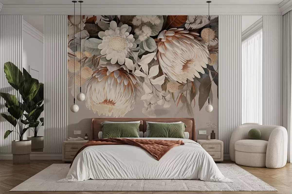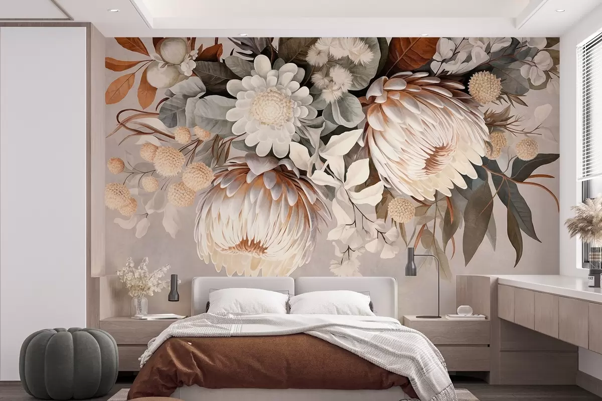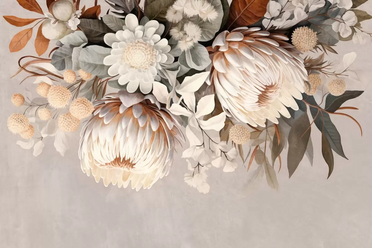 Murais de parede Protea grande e texturizada com detalhes em marrom, margaridas brancas e flores amarelas, fundo bege suave Nr. w09157