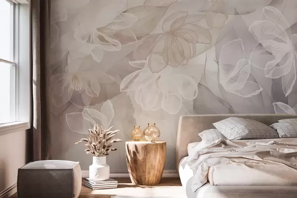 Murais de parede Flores e folhas com pétalas transparentes em tons de branco, bege e roxo, suaves e delicadas Nr. w09158