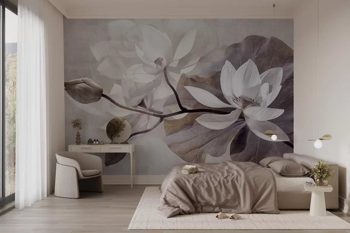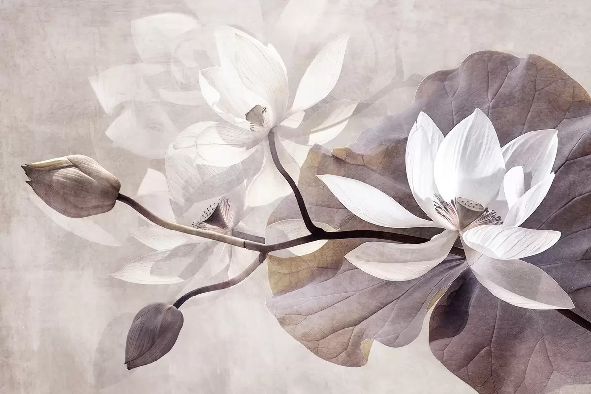 Murais de parede Flores de lótus delicadas, com textura granulada e suave, com folhas e hastes em uma paleta de cores bege suave Nr. w09159