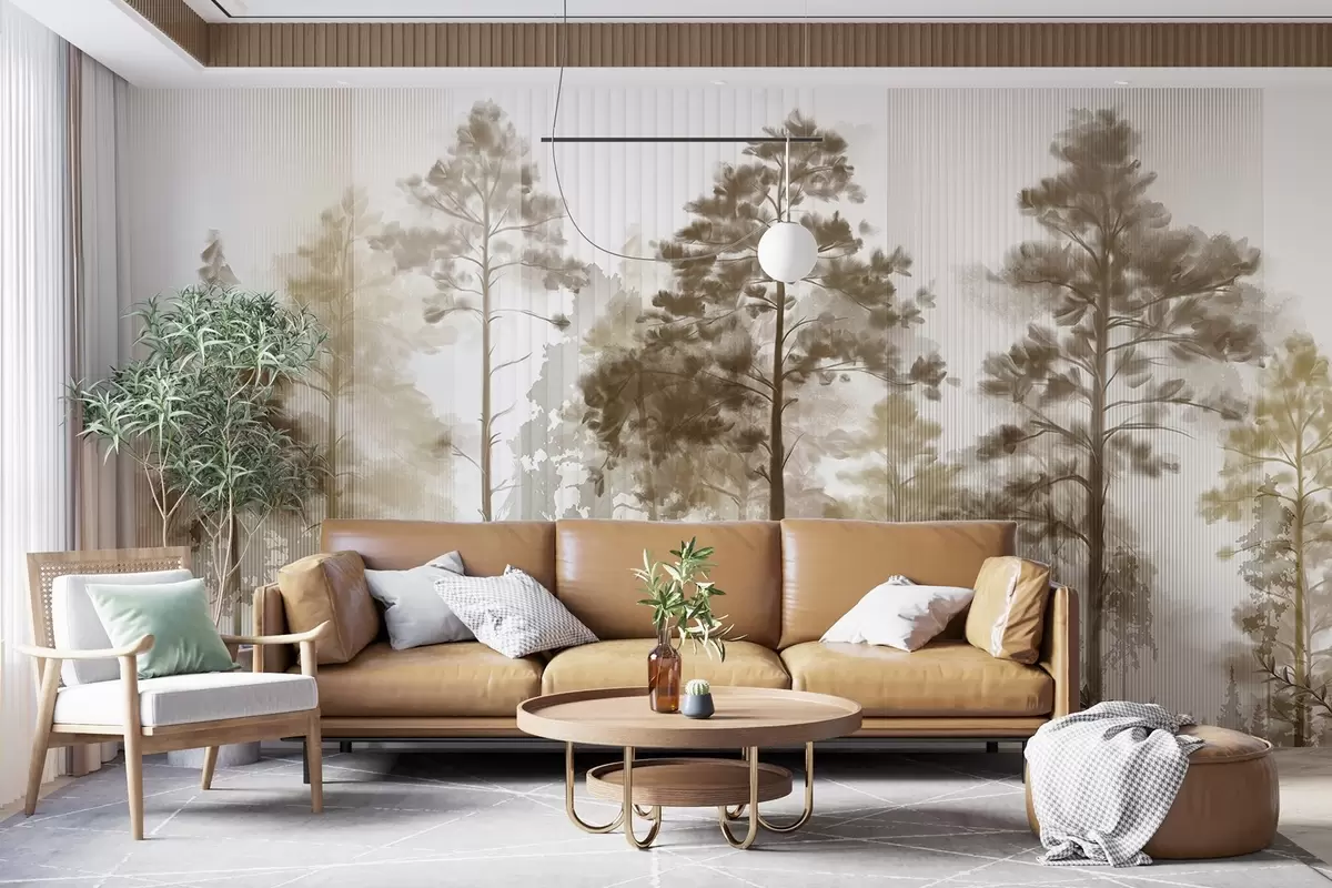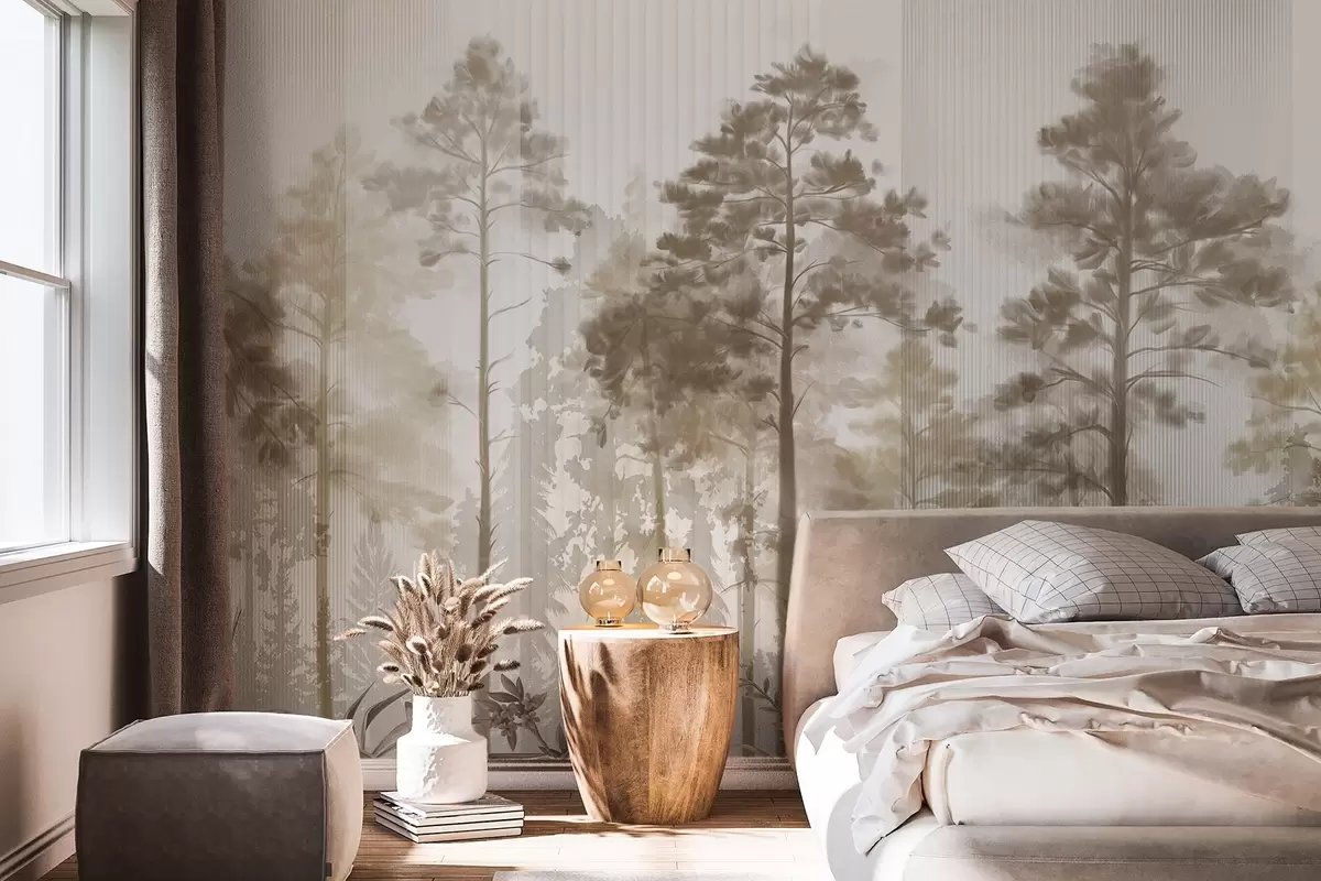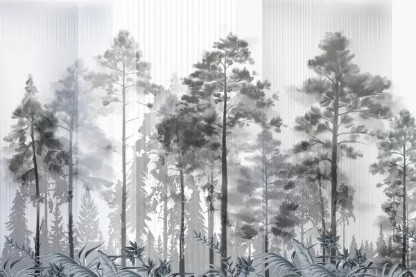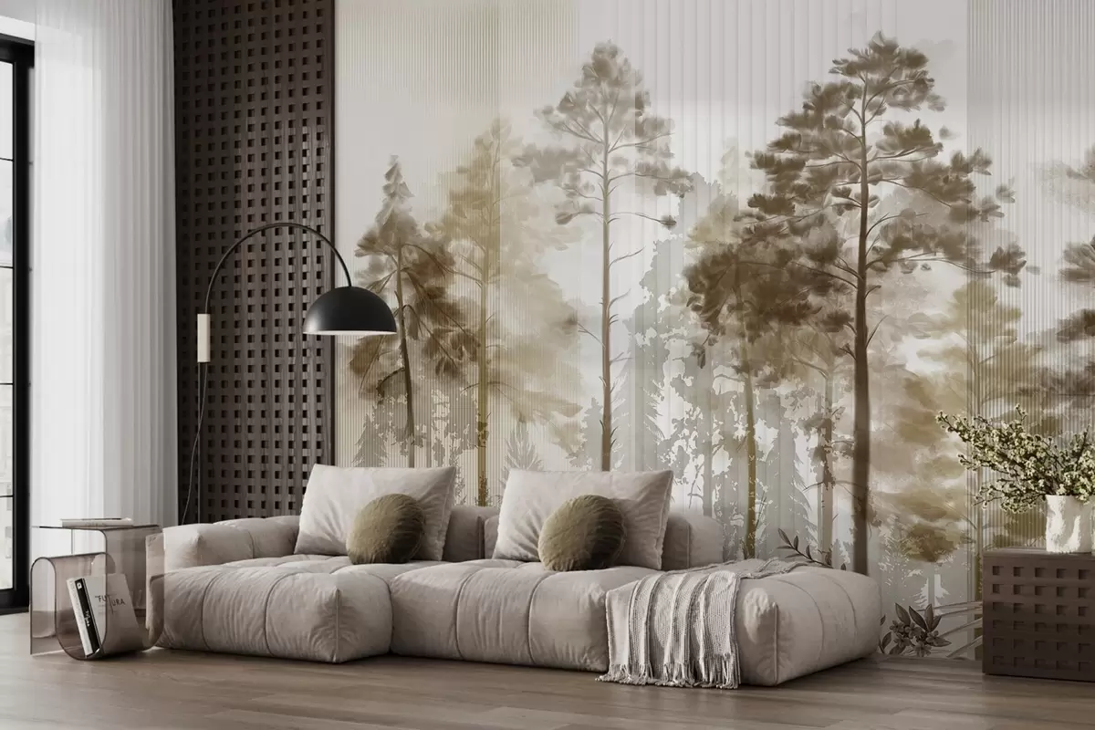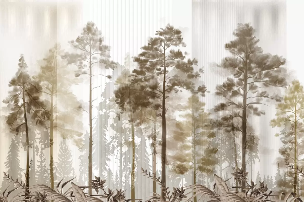 Murais de parede Uma floresta densa com pinheiros altos, folhagem bege exuberante, uma atmosfera enevoada com texturas de linhas verticais Nr. w09163v1