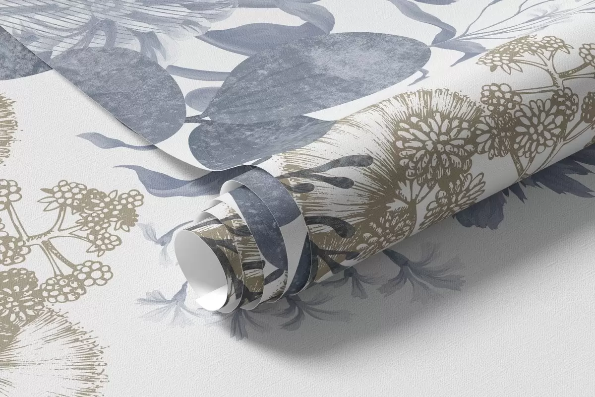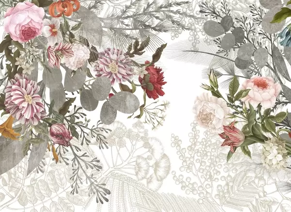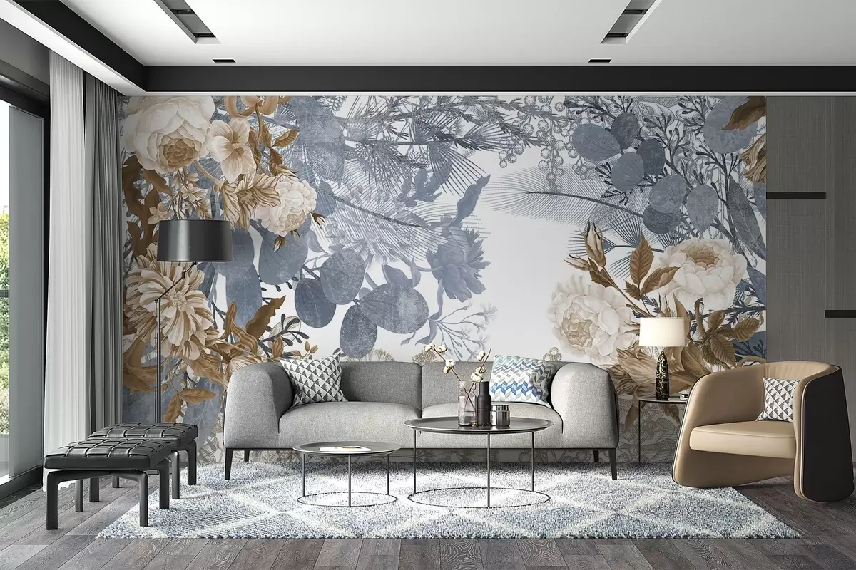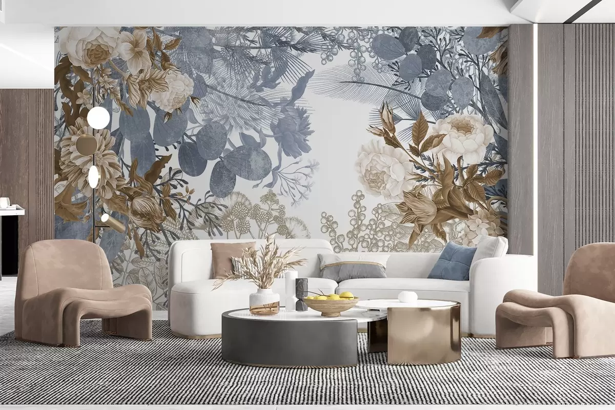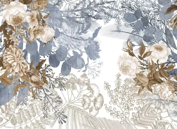 Murais de parede Arranjo floral vintage com rosas, eucalipto e mimosa em tons de azul e marrom Nr. w09164