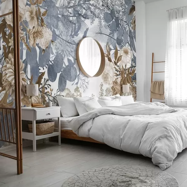 Murais de parede Arranjo floral vintage com rosas, eucalipto e mimosa em tons de azul e marrom Nr. w09164