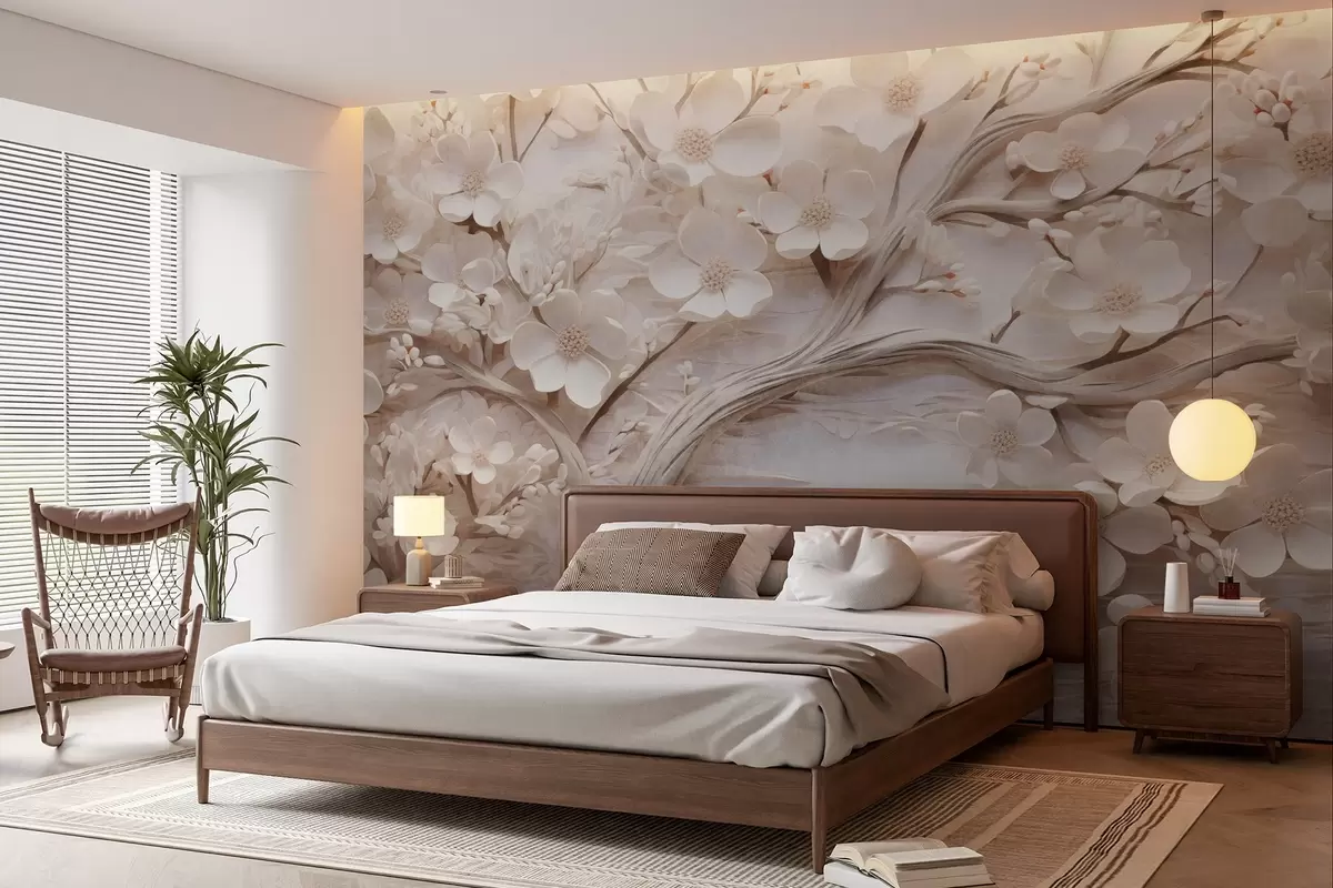 Murais de parede Árvore texturizada com flores brancas e tronco marrom, o fundo é branco com linhas horizontais e iluminação suave Nr. w09166