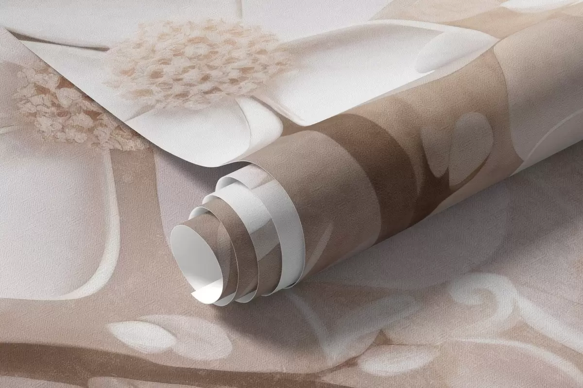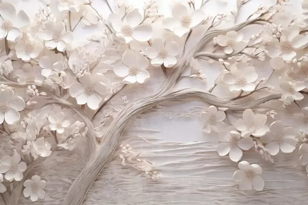 Murais de parede Árvore texturizada com flores brancas e tronco marrom, o fundo é branco com linhas horizontais e iluminação suave Nr. w09166
