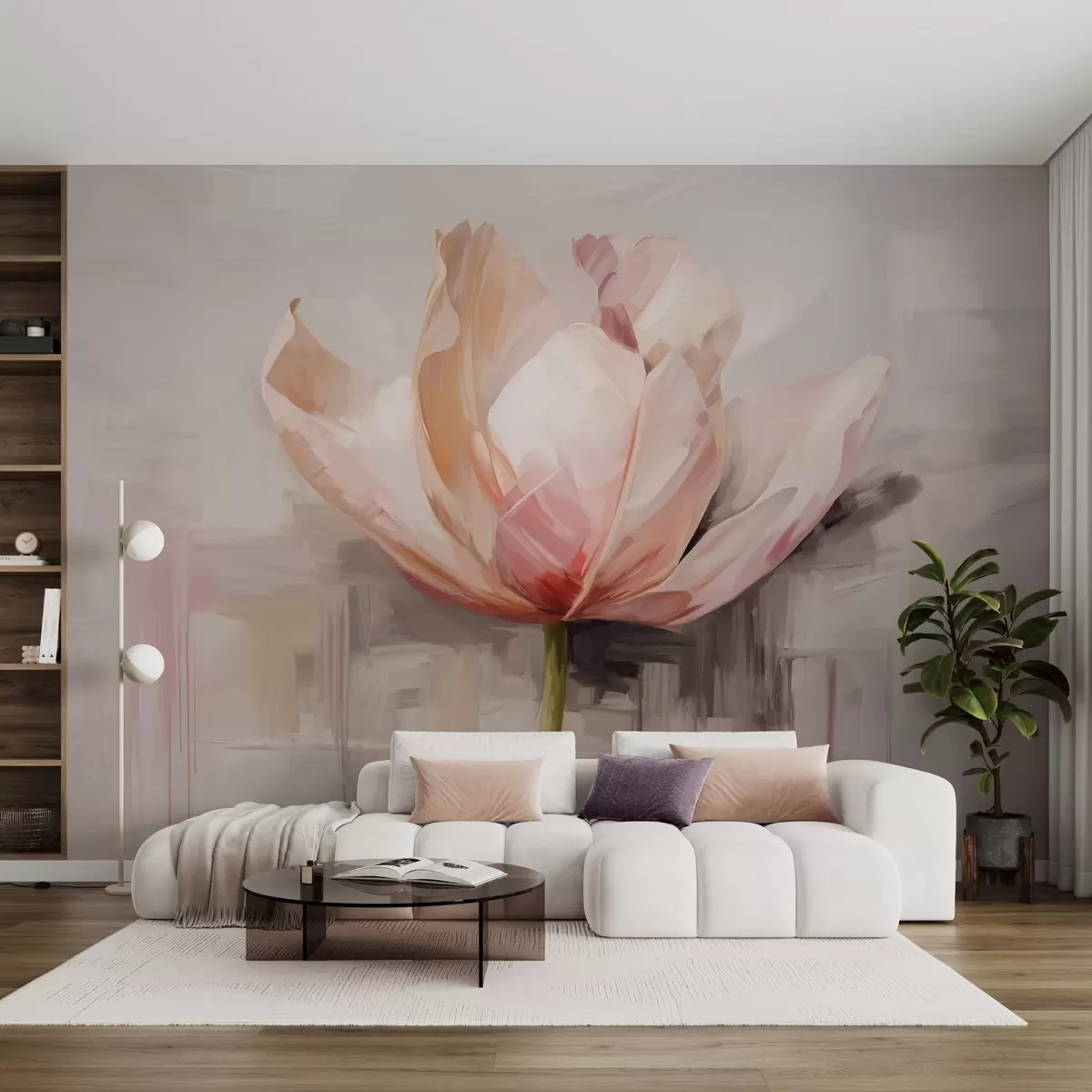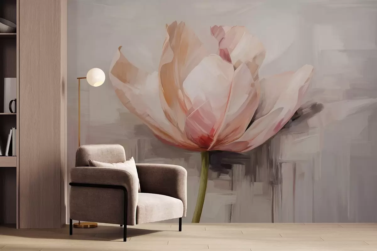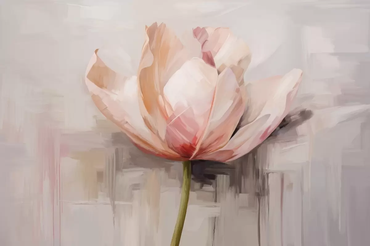 Murais de parede Tulipa rosa, imitação de pintura a óleo com pinceladas suaves, fundo abstrato com tons pastéis de cinza e bege Nr. w09187