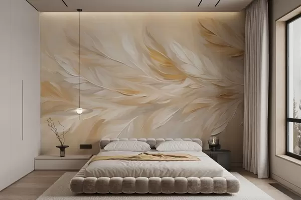 Murais de parede Penas brancas e bege dispostas em uma estampa fluida, textura suave, paleta de cores quentes, fundo abstrato Nr. w09191