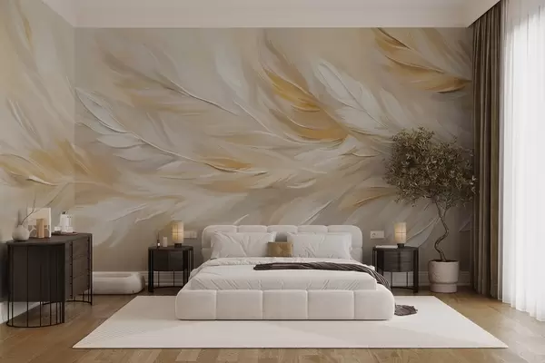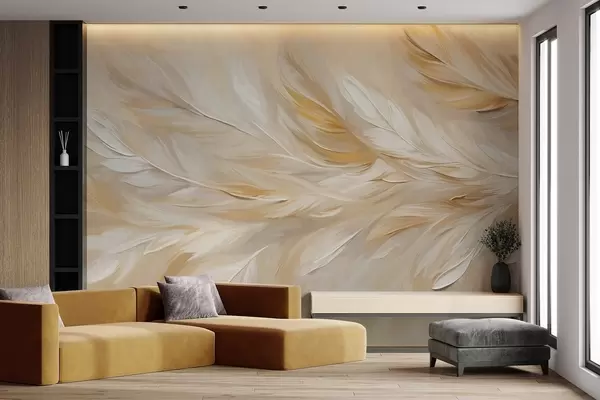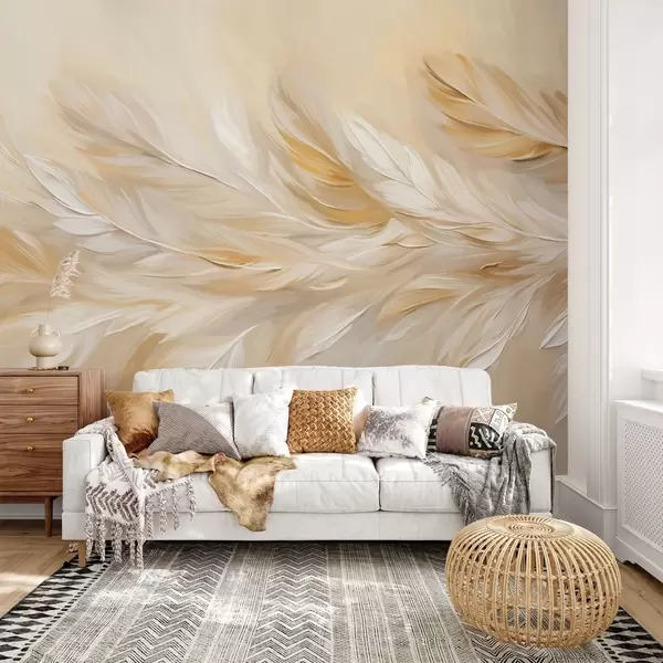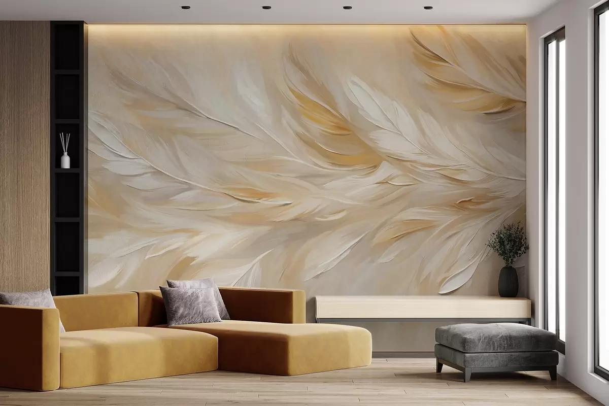 Murais de parede Penas brancas e bege dispostas em uma estampa fluida, textura suave, paleta de cores quentes, fundo abstrato Nr. w09191
