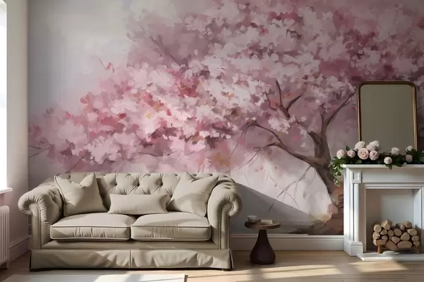 Murais de parede Árvore abstrata de flor rosa em plena floração, próxima a um rio, com pinceladas de textura suave e cores pastéis Nr. w09193