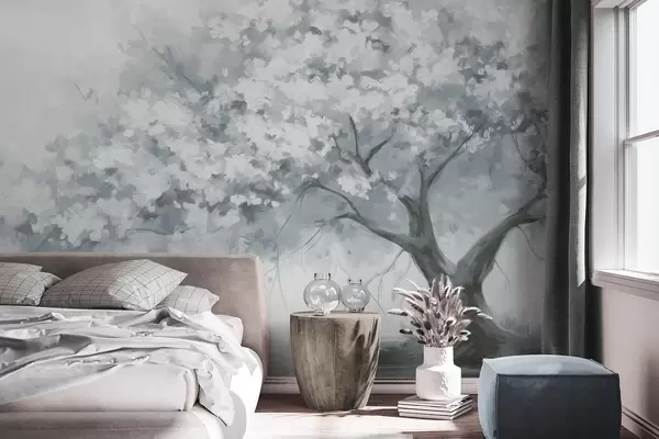 Murais de parede Árvore abstrata de flores azuis suaves em plena floração, próxima a um rio, com pinceladas de textura suave e cores pastéis Nr. w09193v2