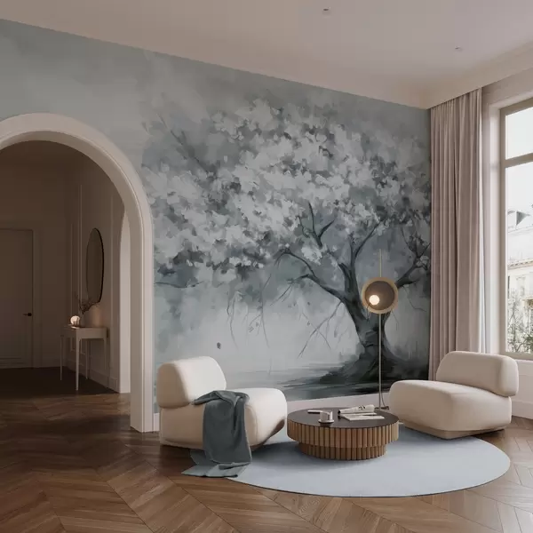 Murais de parede Árvore abstrata de flores azuis suaves em plena floração, próxima a um rio, com pinceladas de textura suave e cores pastéis Nr. w09193v2