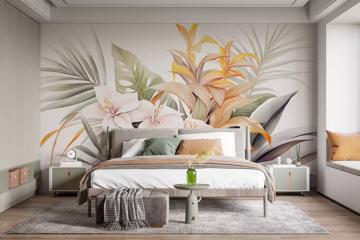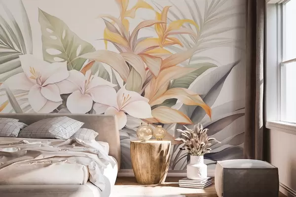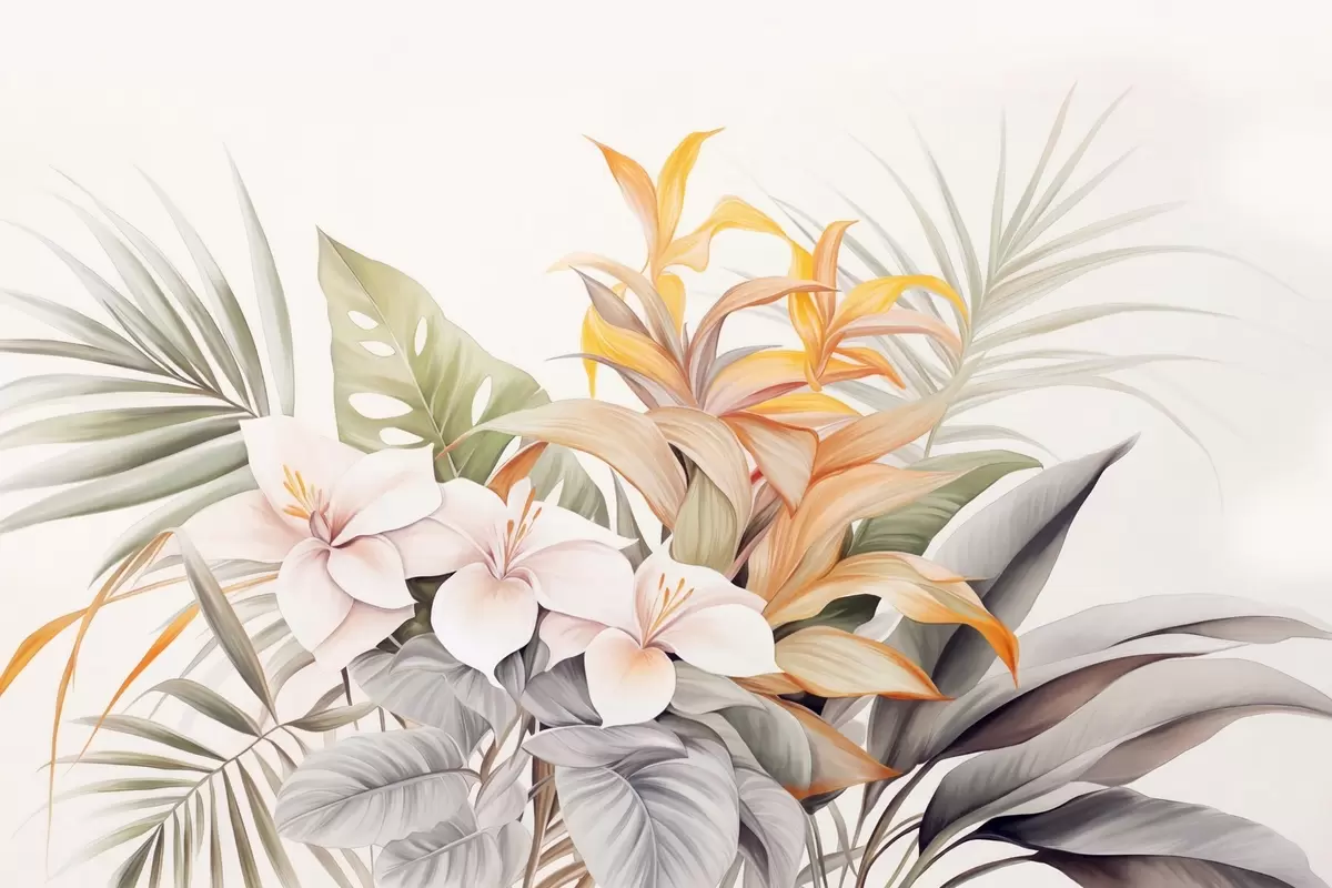 Murais de parede Ilustração botânica de flores tropicais com folhas de palmeira e monstera, cores suaves, estilo aquarela Nr. w09201