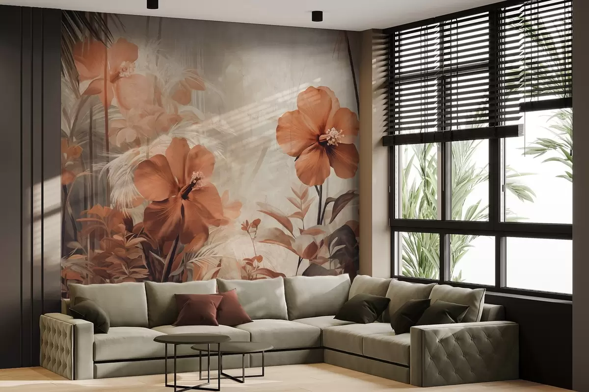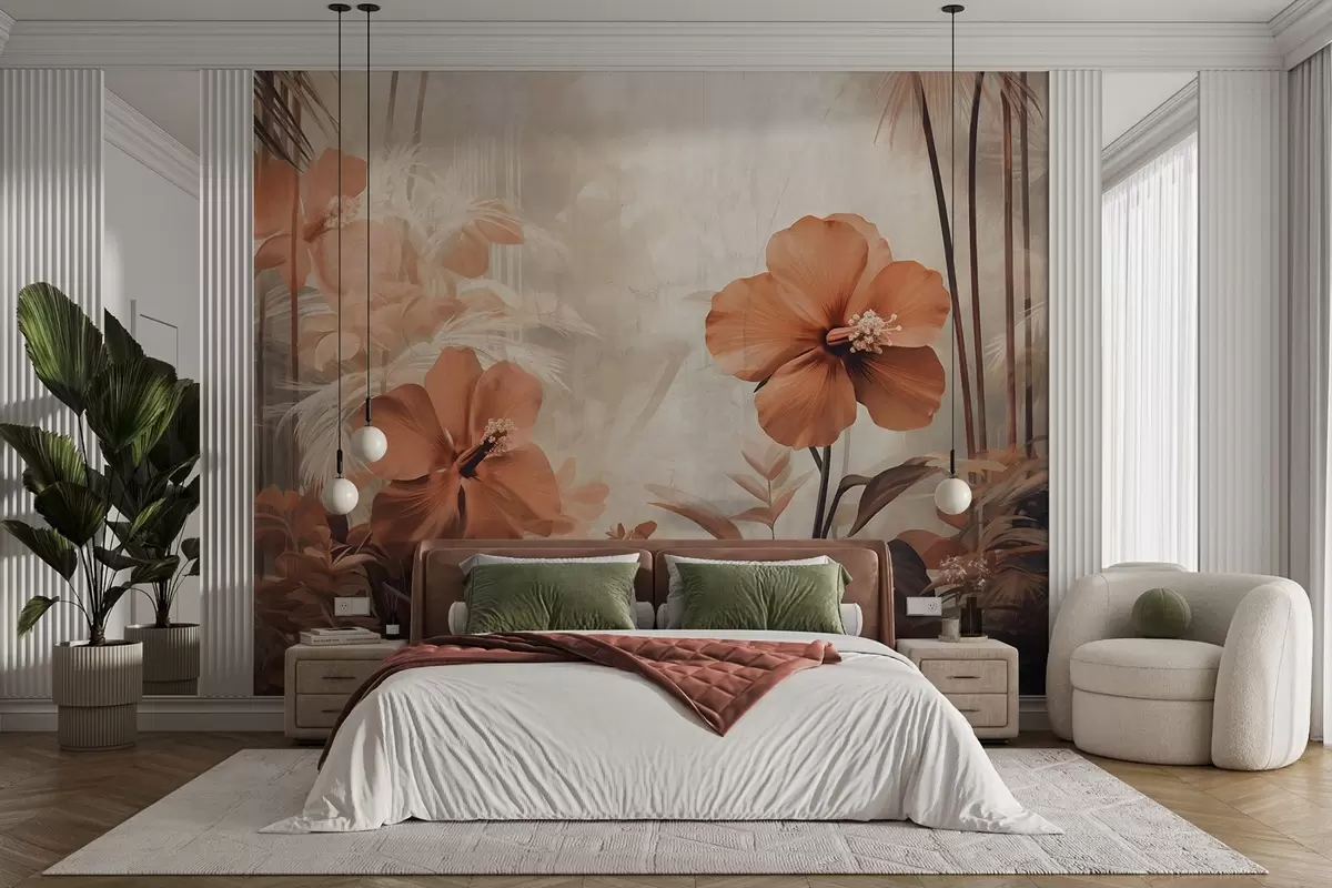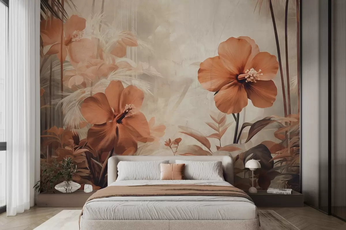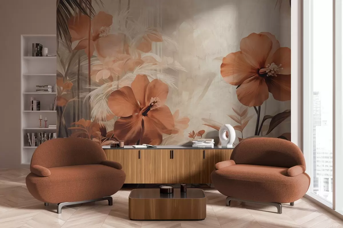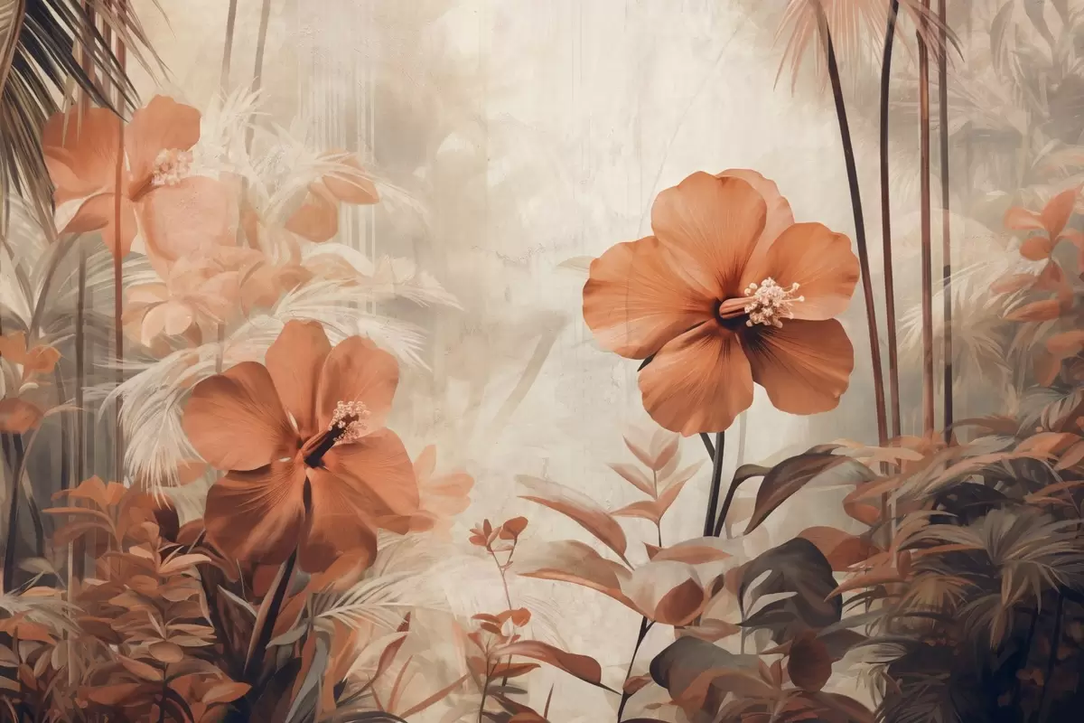 Murais de parede Flores de hibisco vermelho pastel com folhas e caules, vegetação tropical, cores suaves e discretas, estilo vintage Nr. w09203