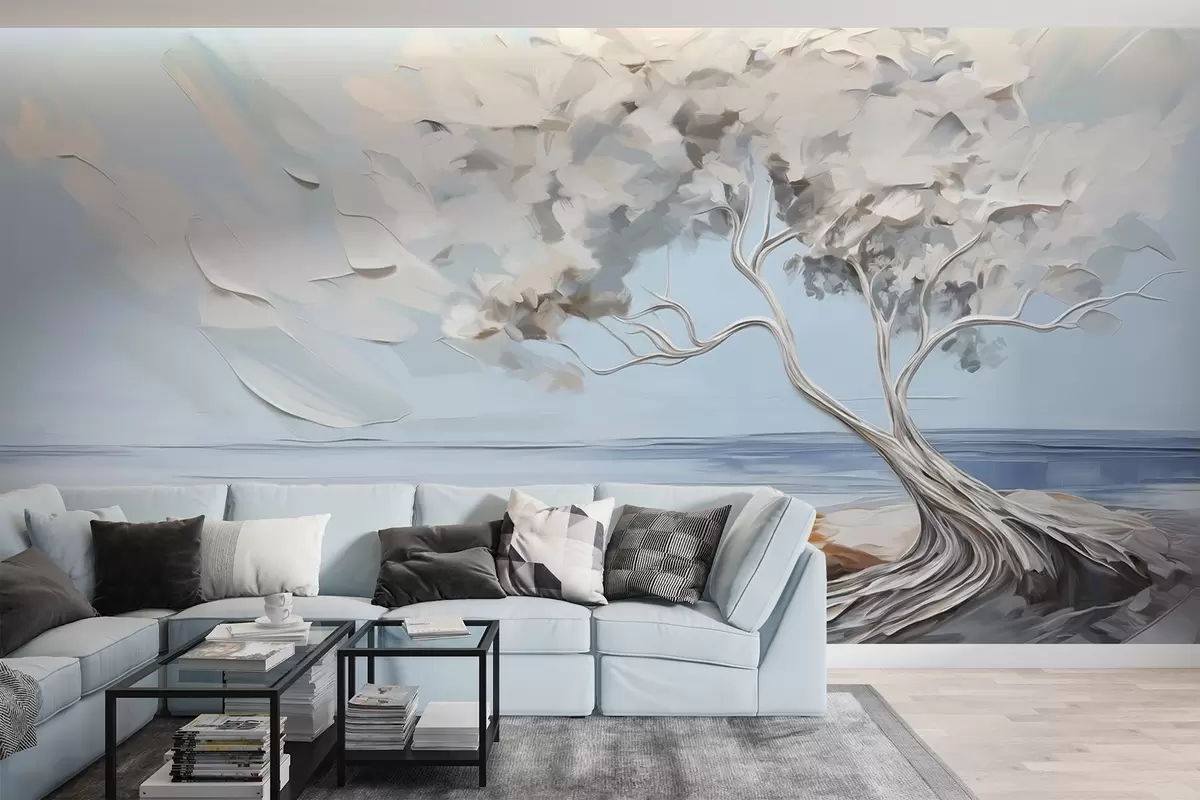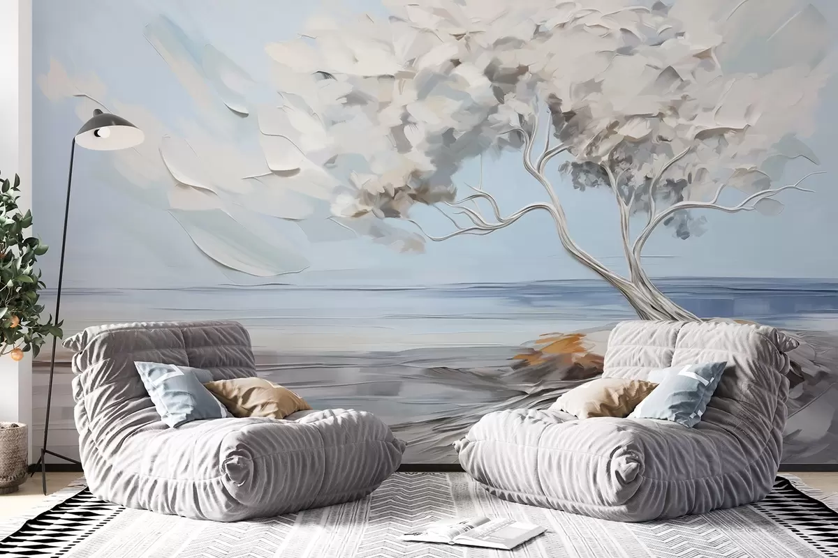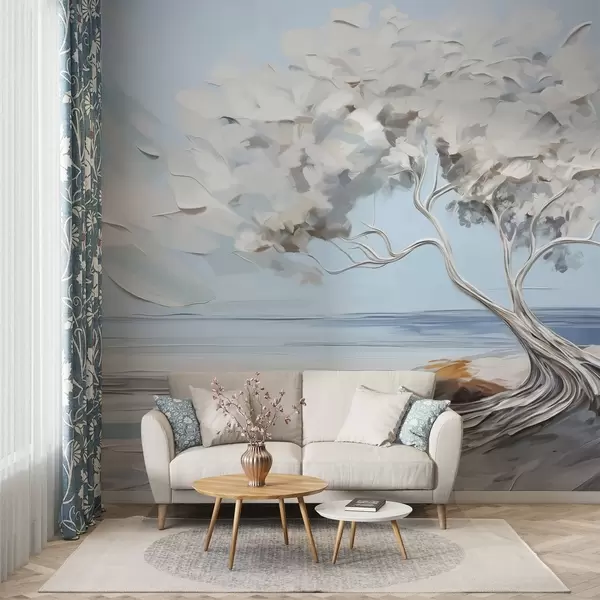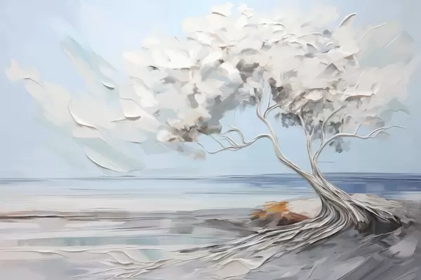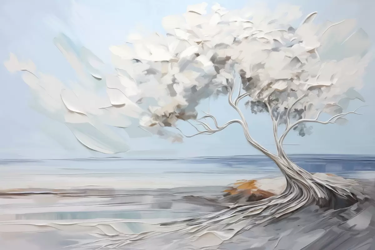 murais de parede Uma árvore branca com folhas grossas e texturizadas em uma praia de areia, paisagem com um céu azul claro w09205