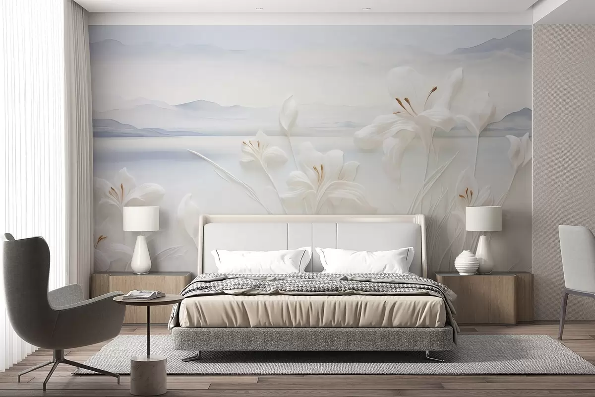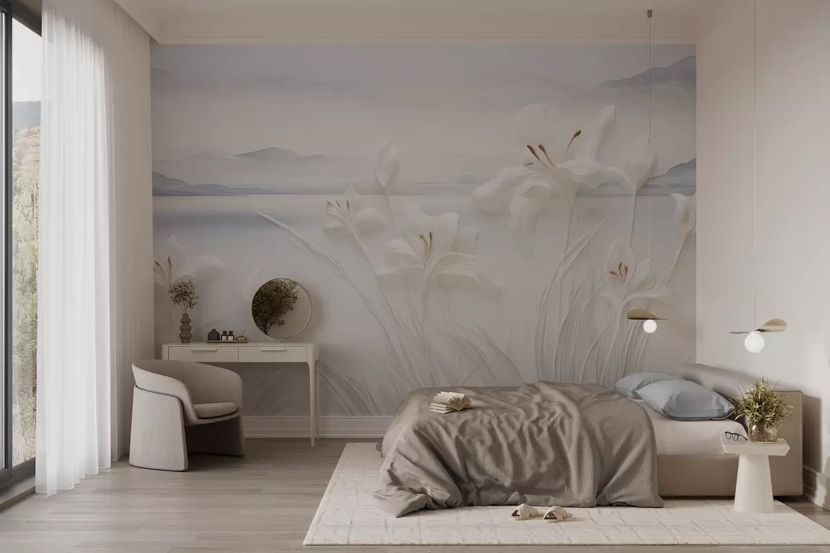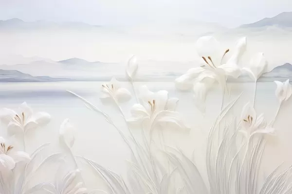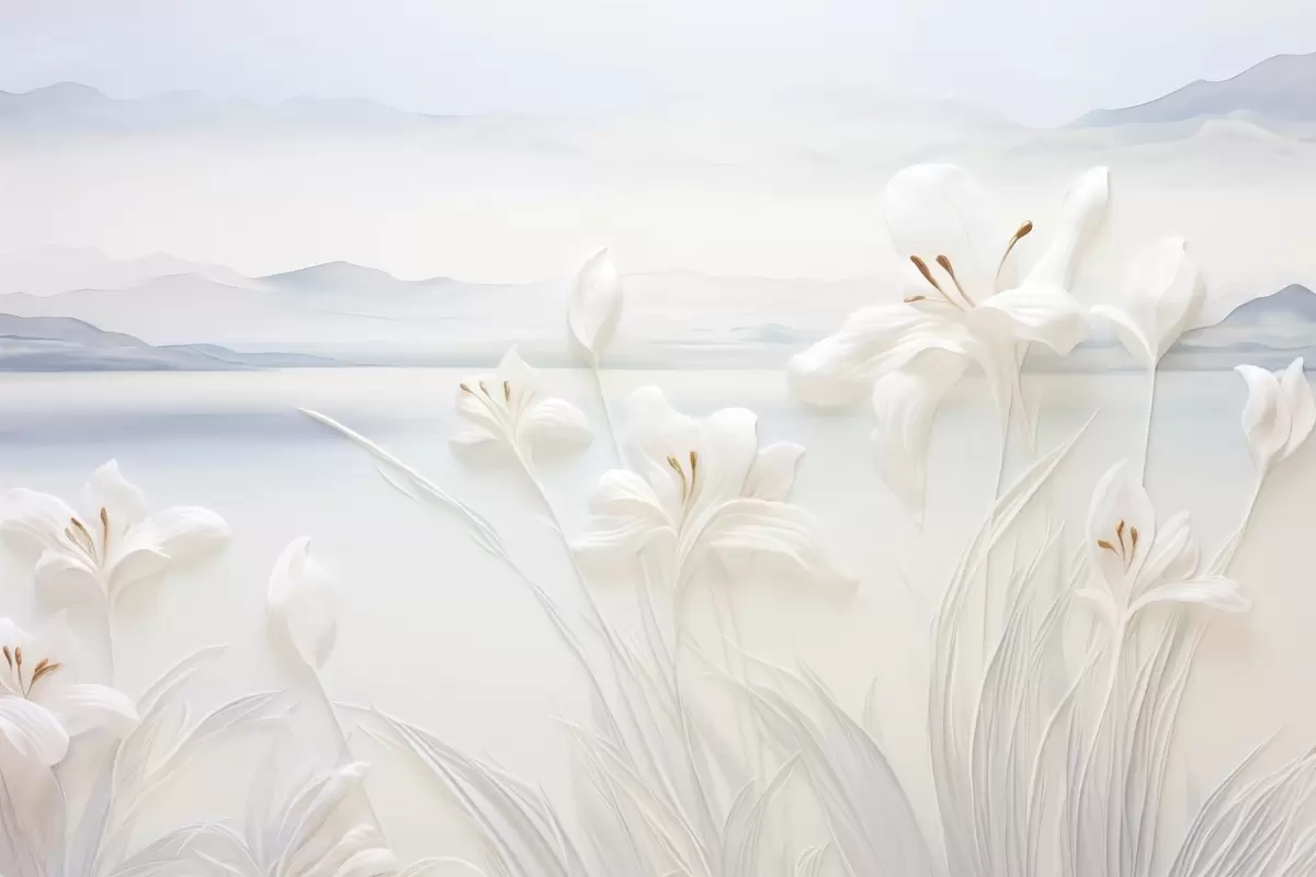 Murais de parede Lírios brancos com longos caules e folhas, montanhas e lago ao fundo, composição de paisagem minimalista Nr. w09206
