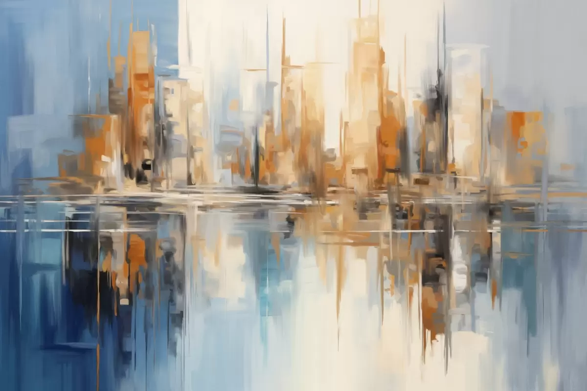 Murais de parede Paisagem urbana abstrata texturizada com prédios altos em tons de laranja, azul e branco, refletidos na água Nr. w09207