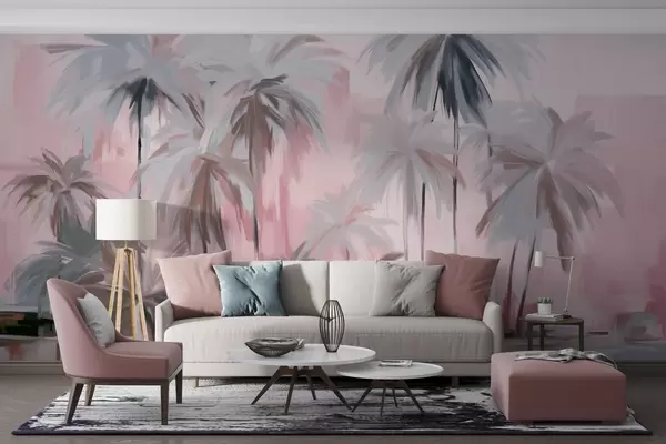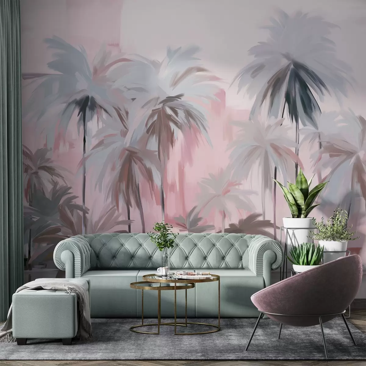 Murais de parede Palmeiras tropicais em tons pastéis, minimalistas e abstratos, em um fundo de tons suaves de rosa e cinza Nr. w09212v1