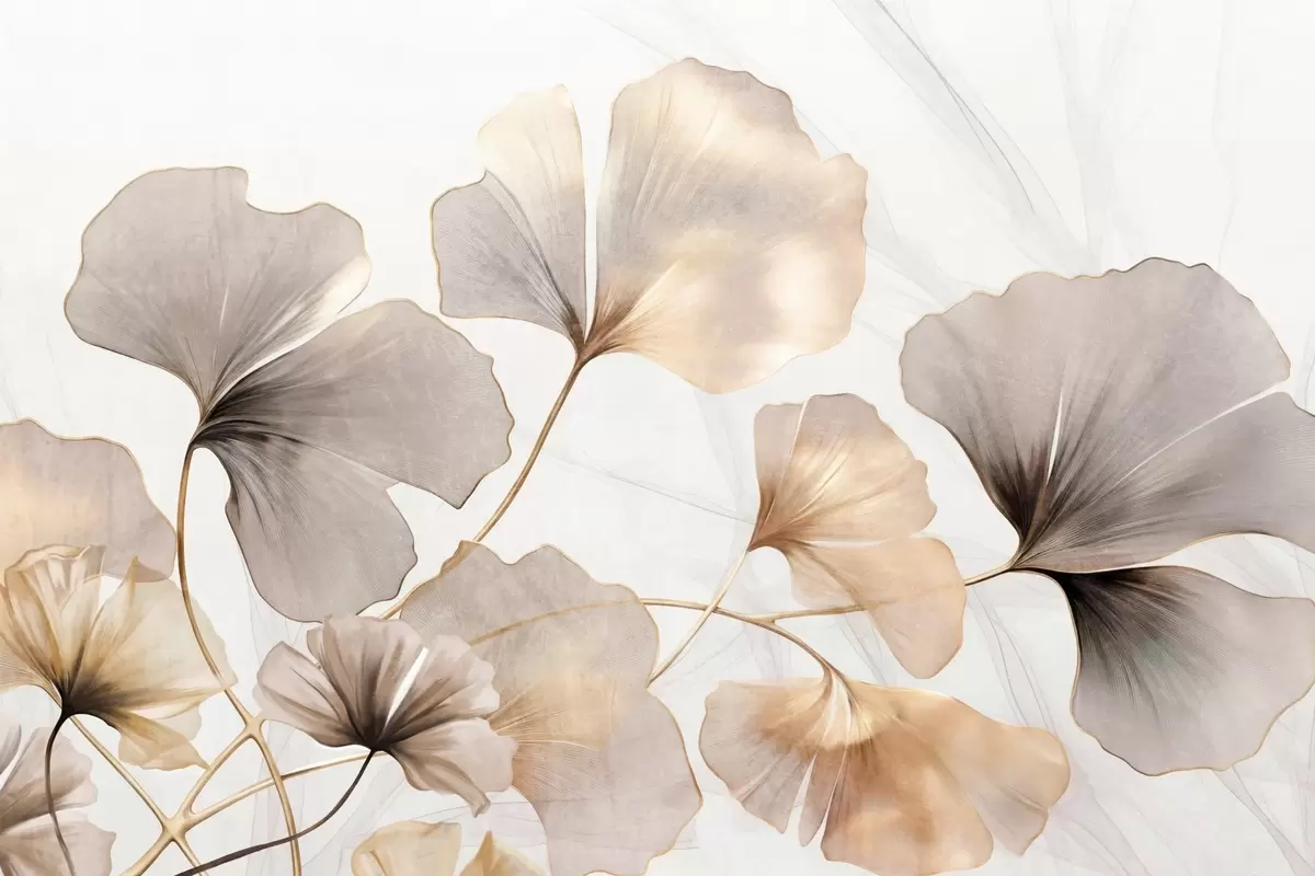 Murais de parede Folhas de Ginkgo biloba em tons de bege, amarelo e marrom, efeito de aquarela com textura delicada, fundo claro Nr. w09215
