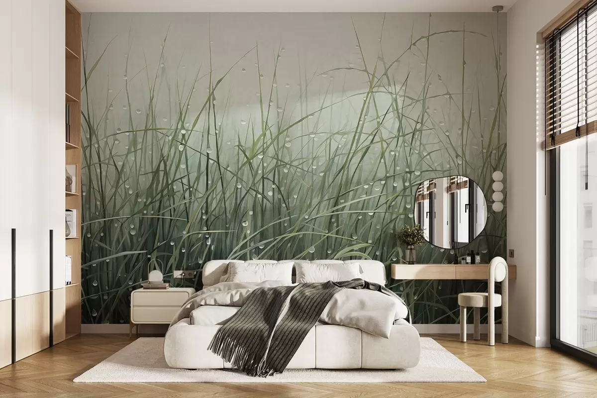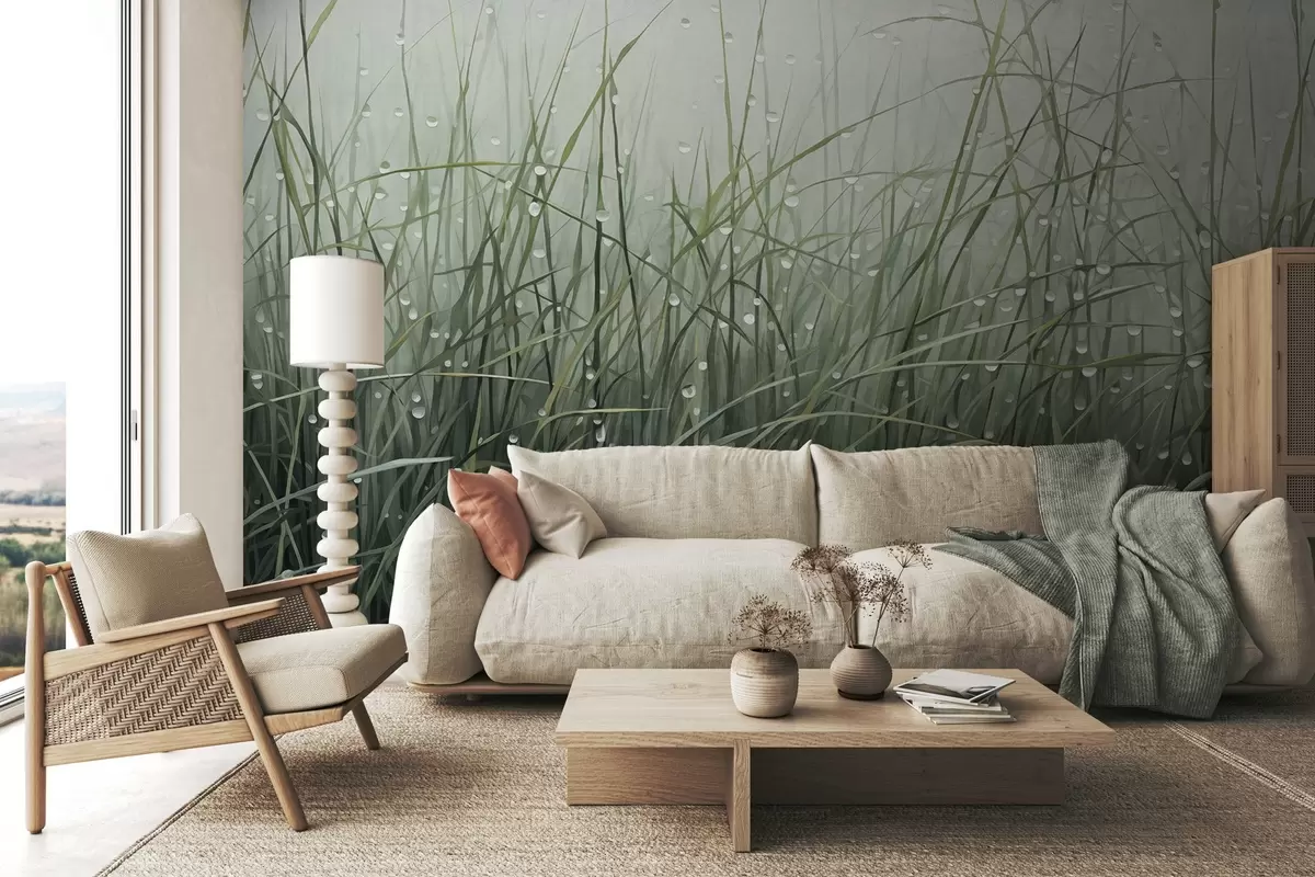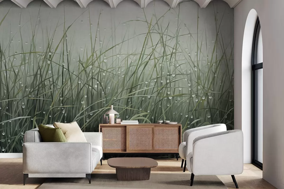 Murais de parede Grama com gotas de água, tons de verde suaves, luz suave, fundo enevoado, estilo abstrato minimalista texturizado Nr. w09217