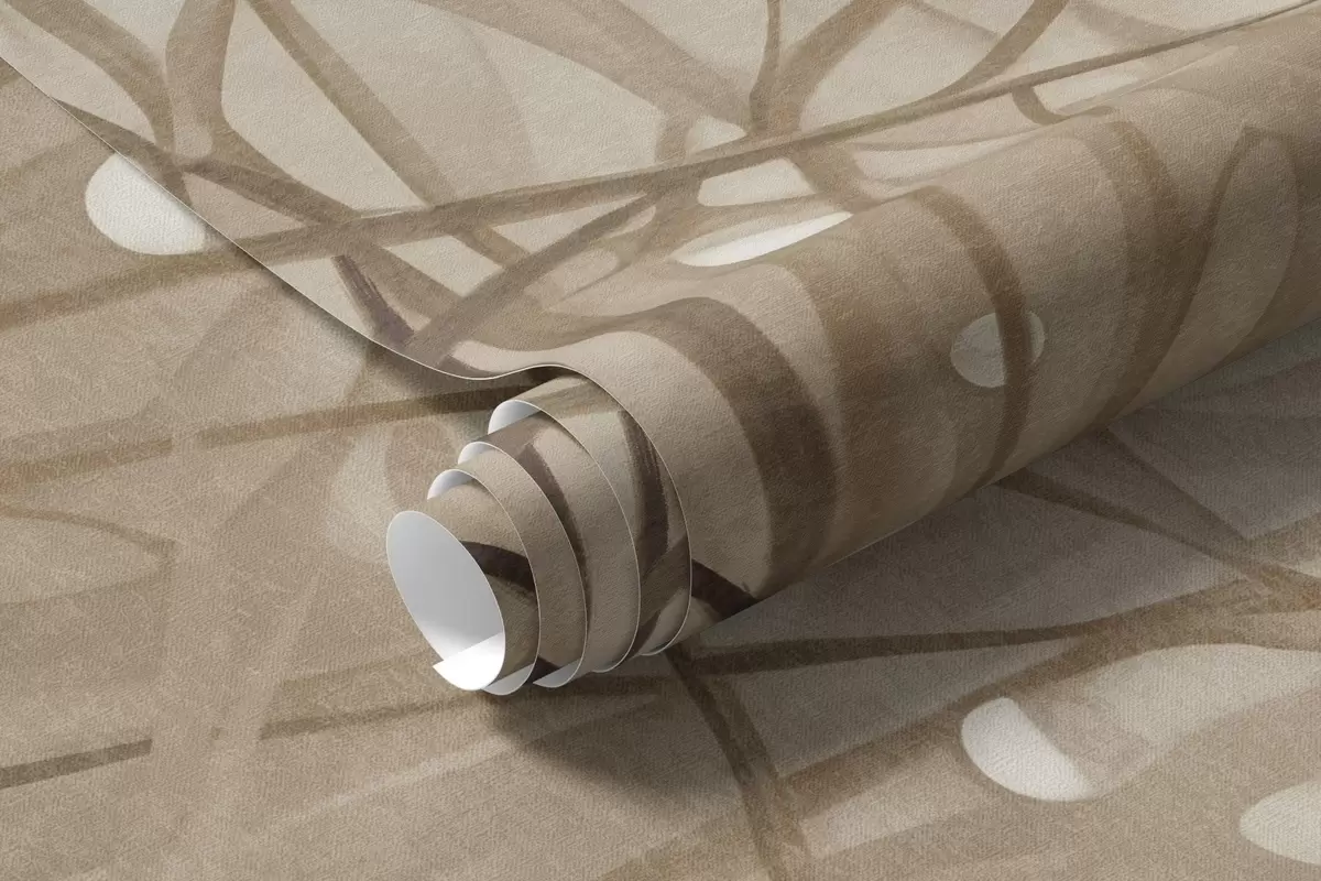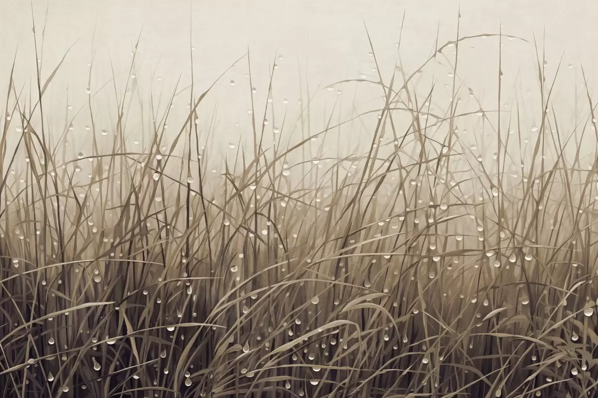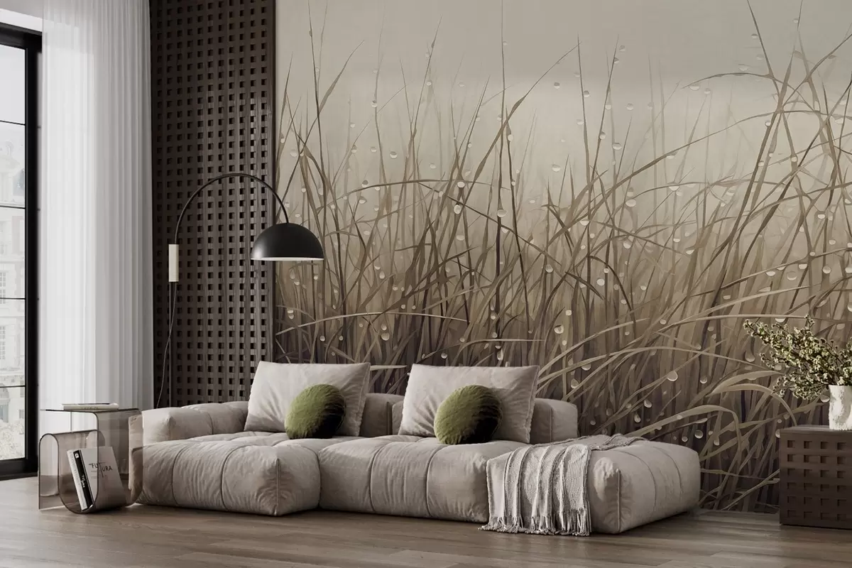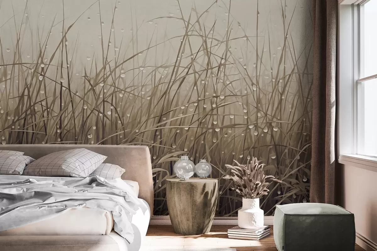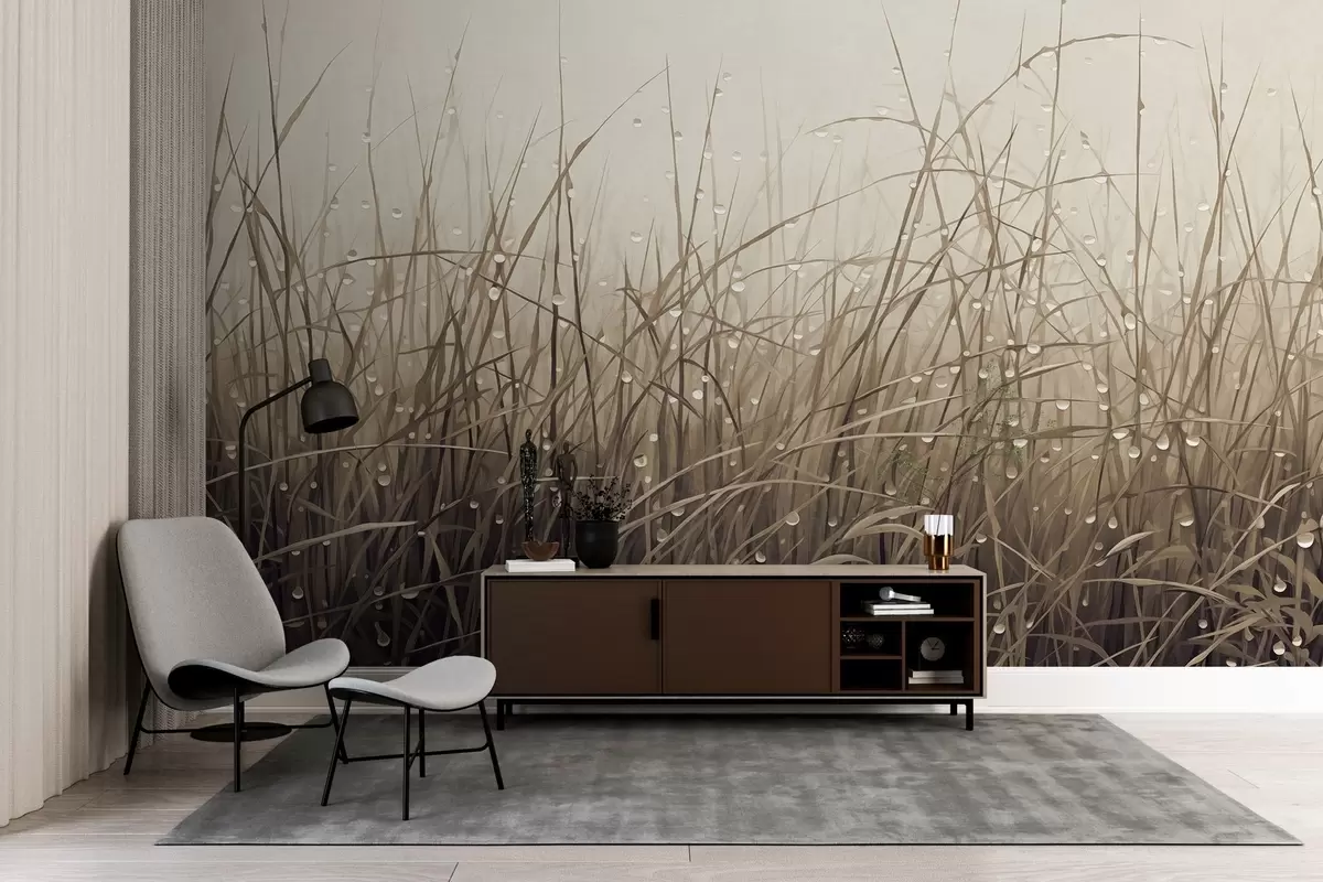 Murais de parede Grama com gotas de água, tons marrons suaves, luz suave, fundo enevoado, estilo abstrato minimalista texturizado Nr. w09217v1